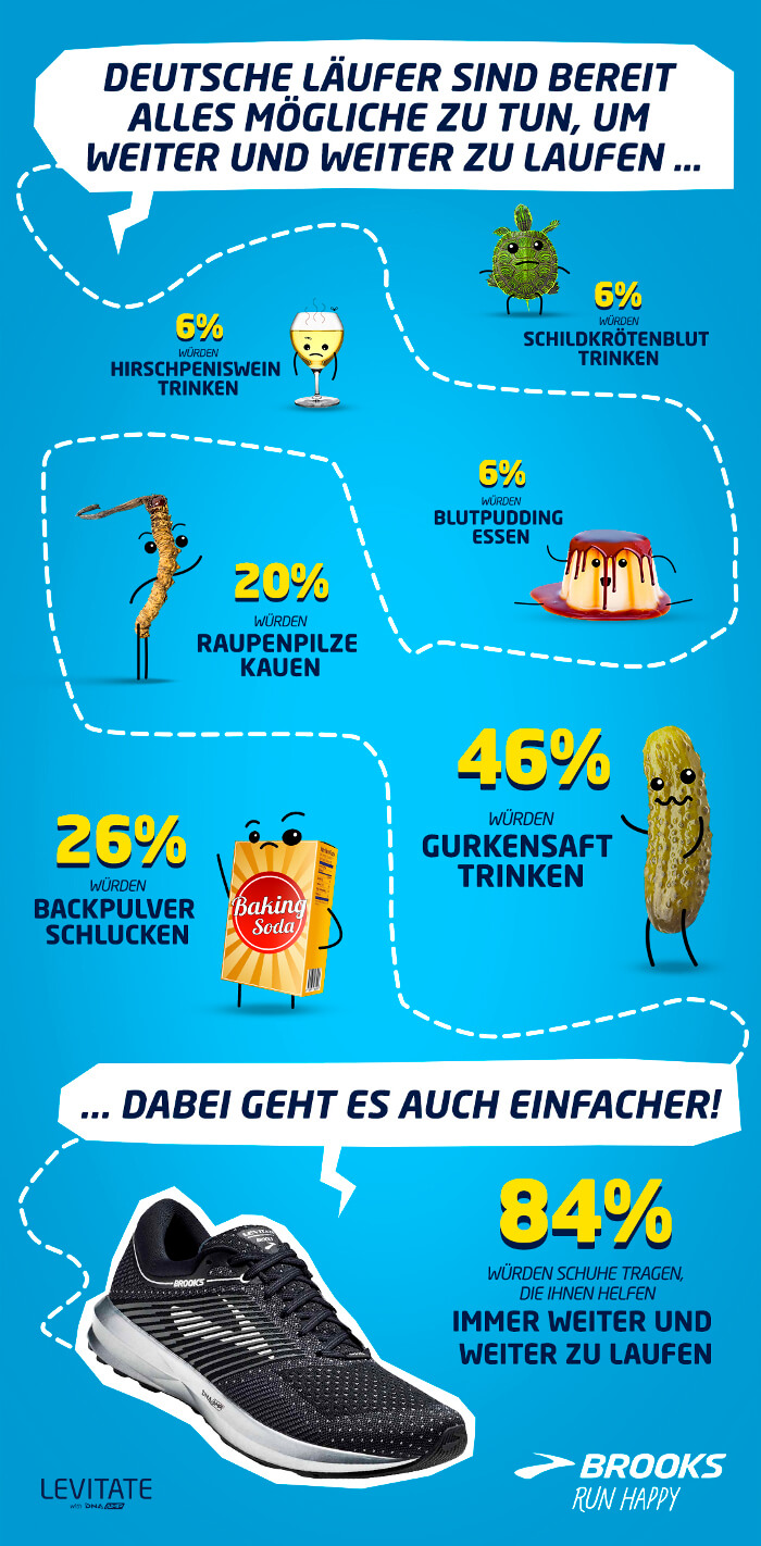 Im Vorfeld der Marathon-Saison hat eine neue, unabhängige Recherche * von Brooks aufgezeigt, was Läufer bereit sind zu tun, um länger laufen zu können. Deutsche Läufer sind dazu bereit, Gurkenwasser zu trinken (46 %), Backpulver zu schlucken (26 %), Raupenpilze (20 %) oder Blutpudding zu essen (6 %) und Hirschpeniswein zu trinken (6 %), um durch die zusätzliche Energie weiter und weiter laufen zu können.