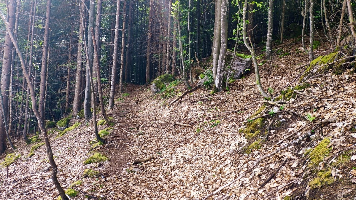 - Nun führt ein steiler Waldweg rund 400 Höhenmeter bergauf