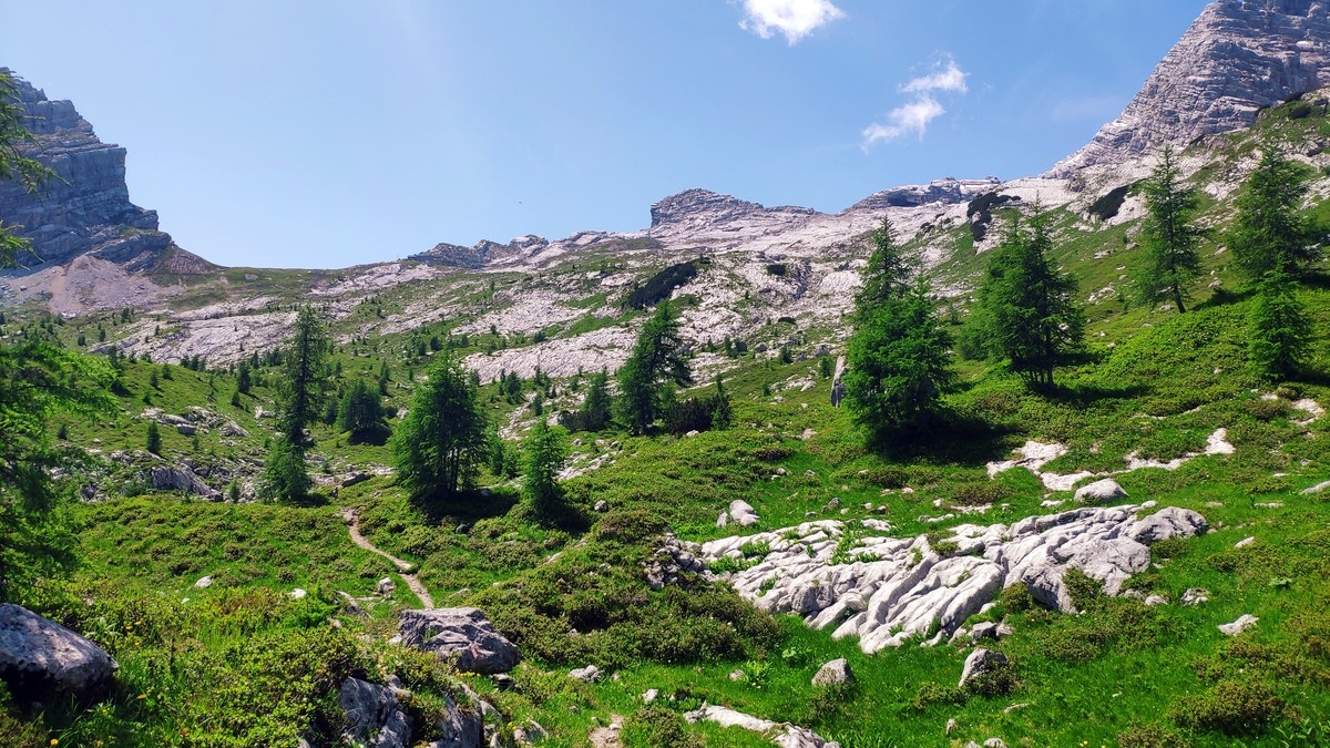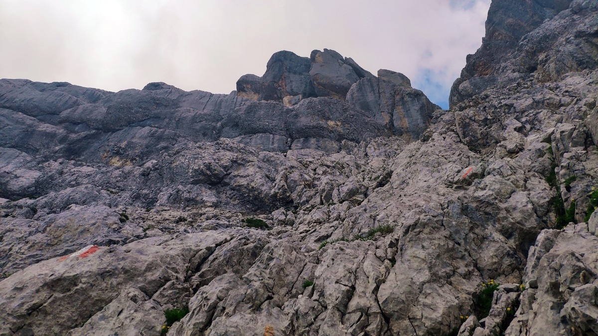 - Dort auf einem Weg absteigen. Dieser zweigt kurze Zeit später bei einer Beschilderung in zwei Wege: Links der neue Weg (mit A-Klettersteig), rechts der alpine, alte Steig. Von der Schwierigkeit sind beide Routen wohl etwa identisch.