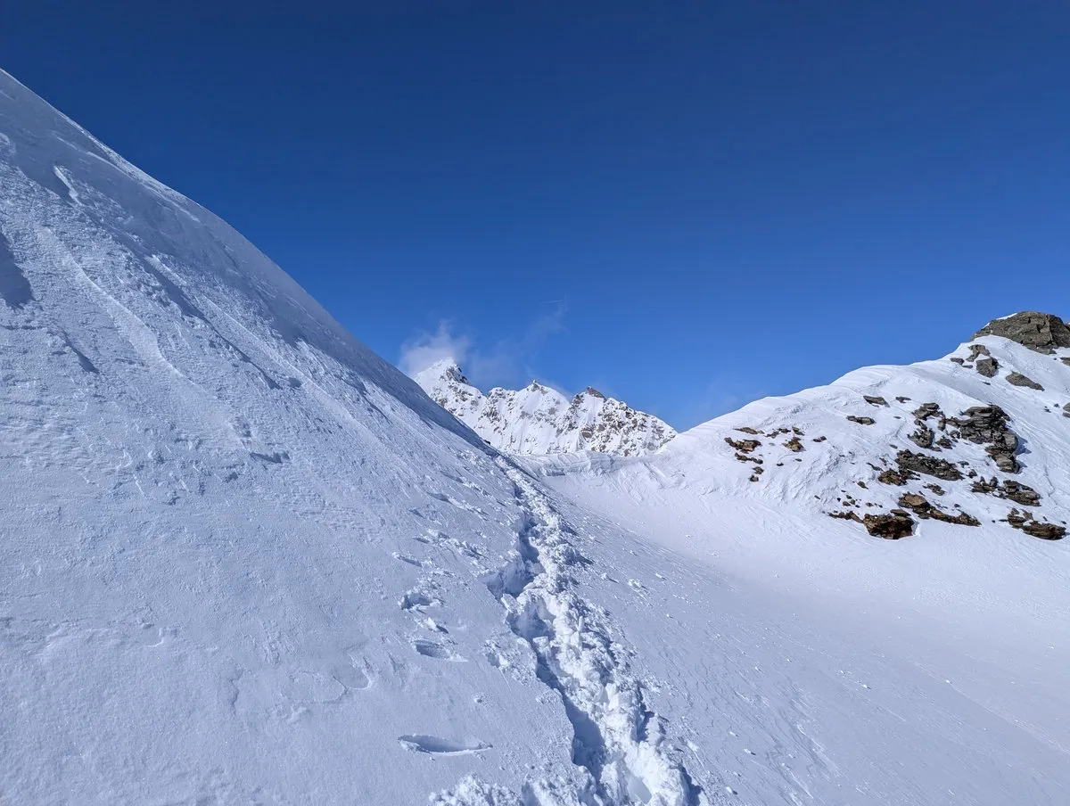- Vom Gipfel führt ein kurzes Stück entlang des Aufstiegs zurück, ehe man nach links zu einer Scharte auf etwa 3.200 Metern Höhe quert.