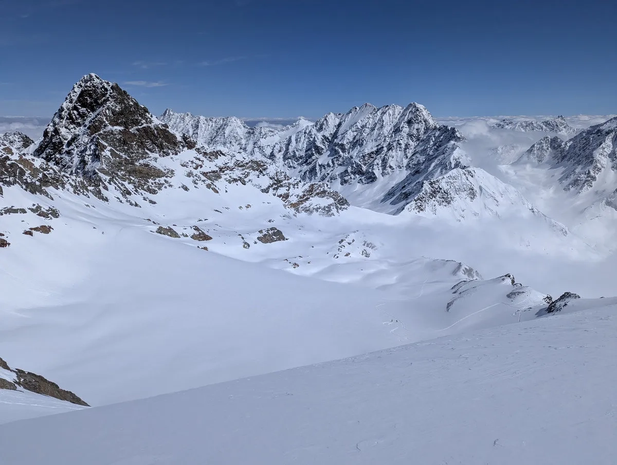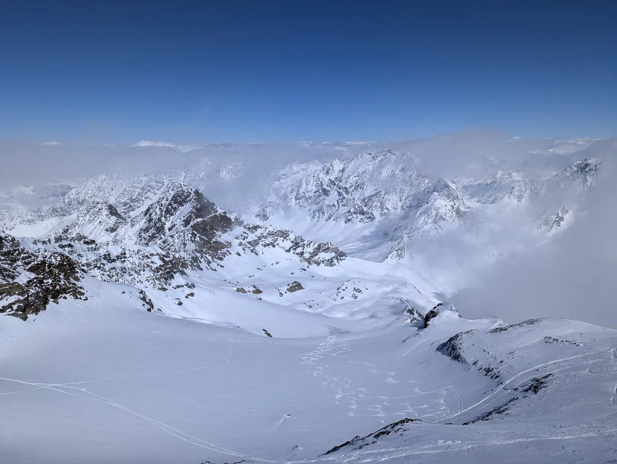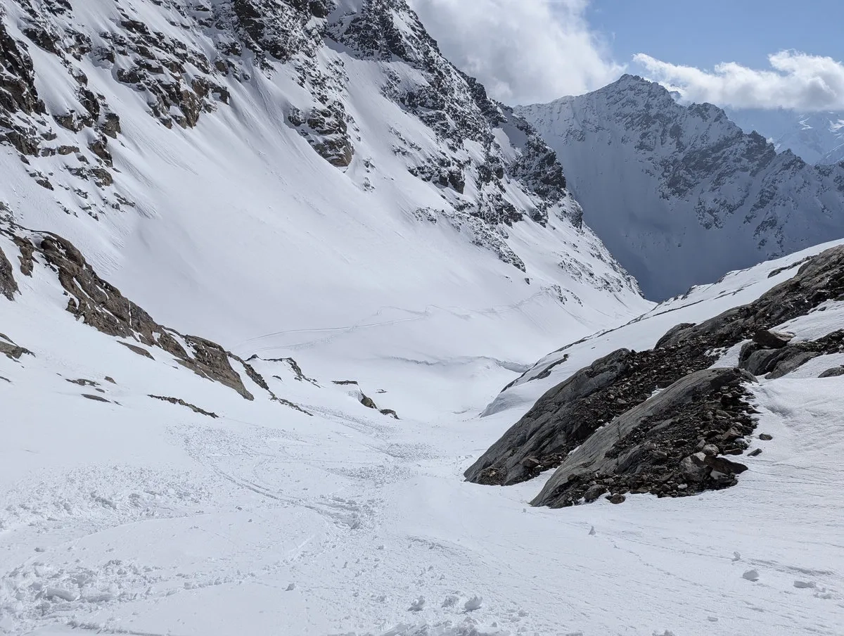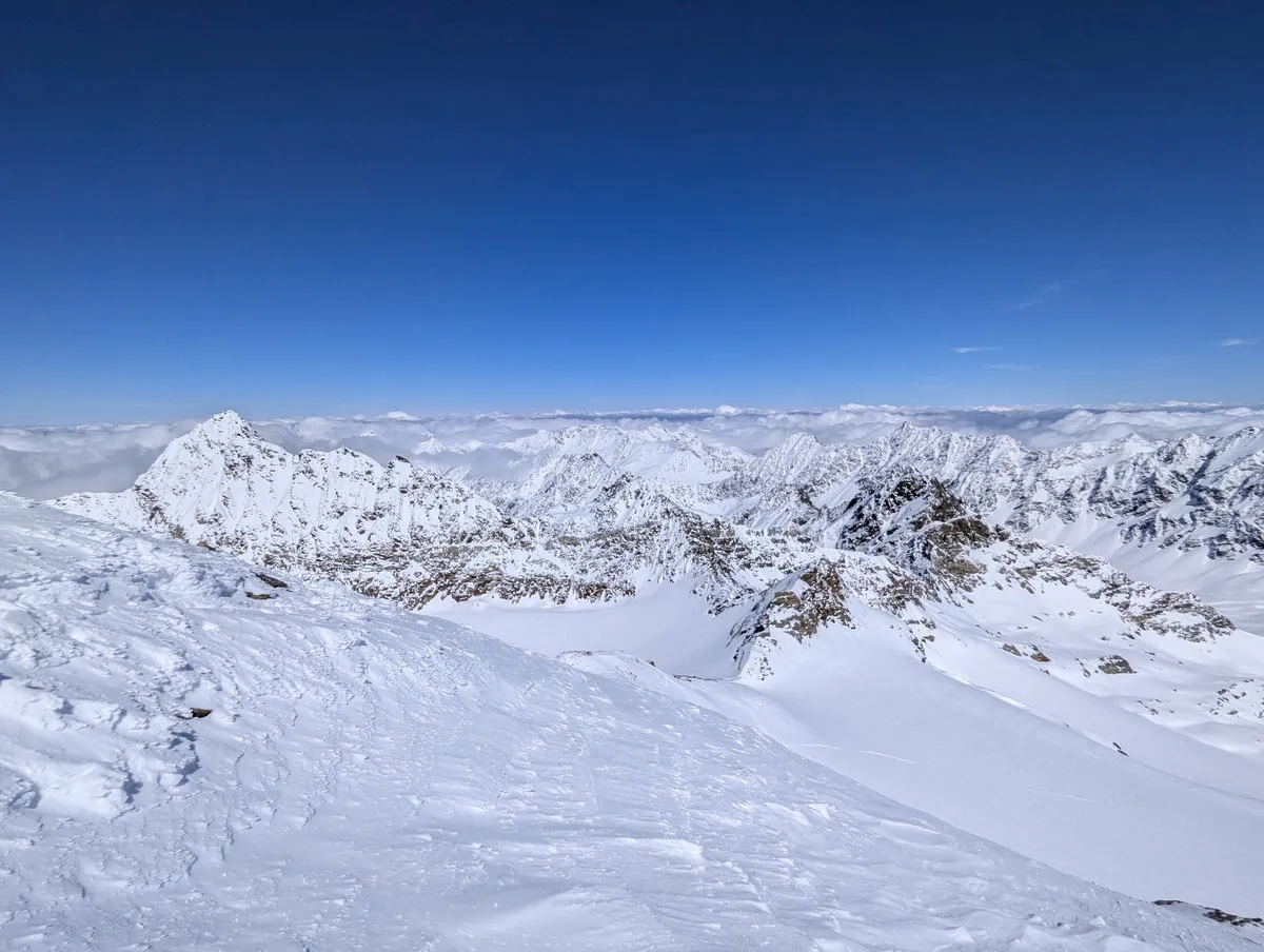 Nach fast 15 Kilometern Aufstieg und über 1.700 Höhenmetern folgt die verdiente Belohnung: eine lange, abwechslungsreiche Abfahrt über den Grasstallferner und das Grastal. Kurz unterhalb des Gipfels führt eine Scharte auf den weitläufigen, flachen Gletscher, über den man die nächsten zehn Kilometer Richtung Niederthai gleitet.