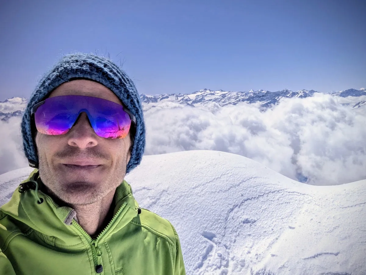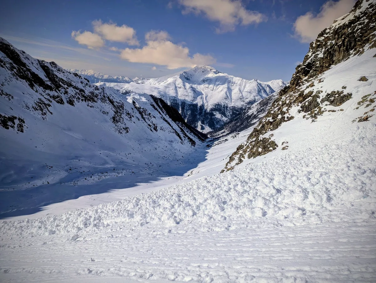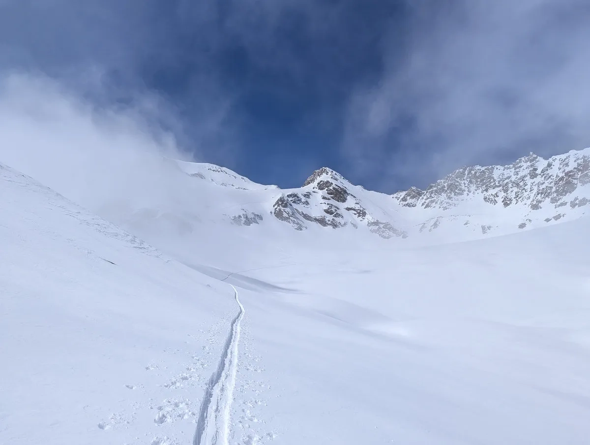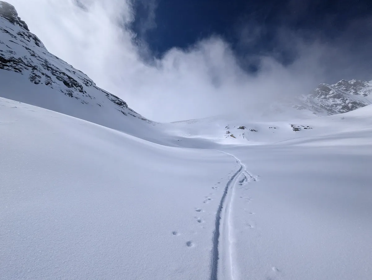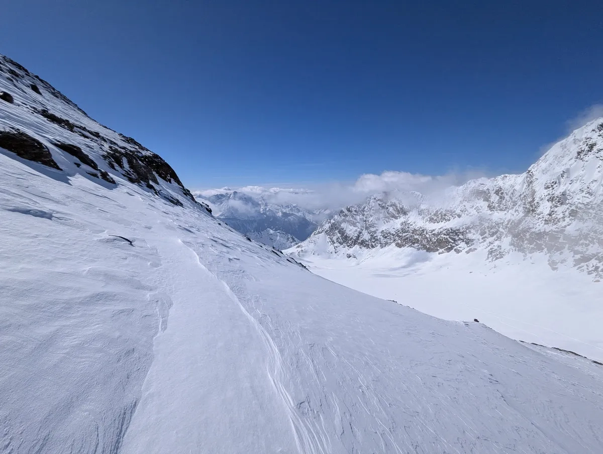 Nach fast 15 Kilometern Aufstieg und über 1.700 Höhenmetern folgt die verdiente Belohnung: eine lange, abwechslungsreiche Abfahrt über den Grasstallferner und das Grastal. Kurz unterhalb des Gipfels führt eine Scharte auf den weitläufigen, flachen Gletscher, über den man die nächsten zehn Kilometer Richtung Niederthai gleitet.