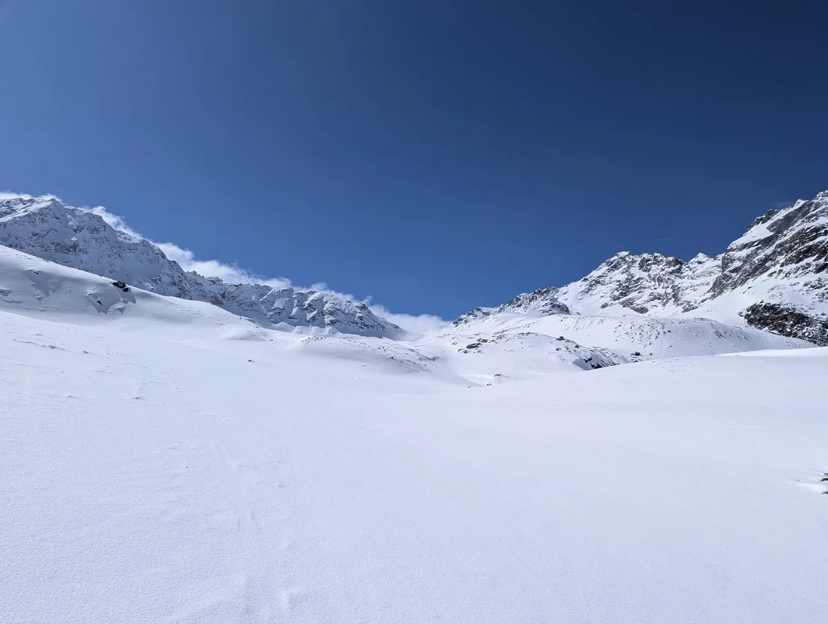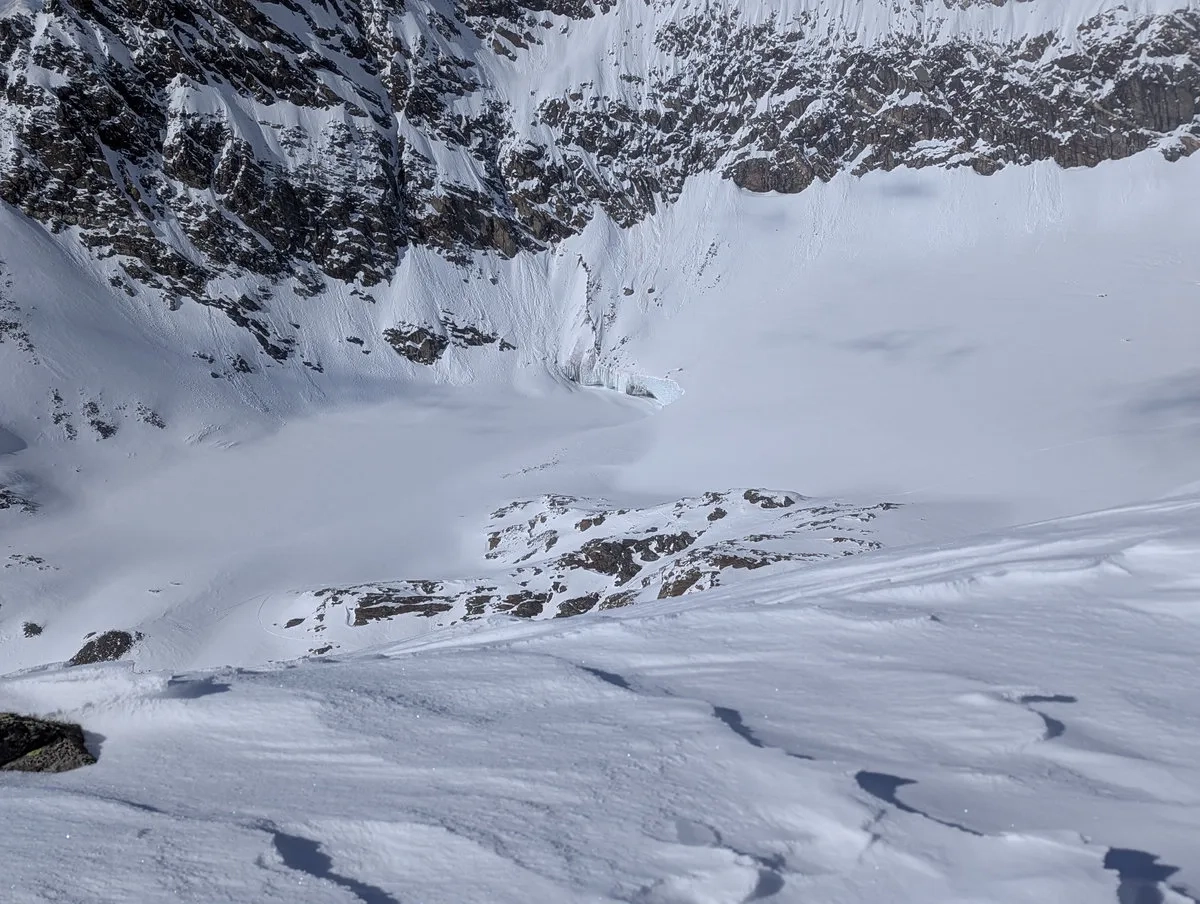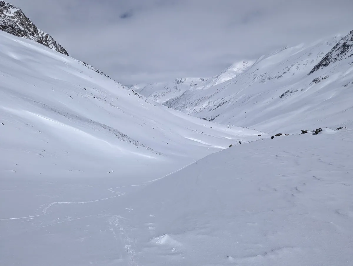 - Dort gleitet man rund 200 Höhenmeter sanft bergab und passiert links einen Eisbruch. Anschließend scharf nach links in eine breite Rinne und weiter Richtung Westen, ehe man rechts vom Grasstallsee den Blick ins Grastal öffnet. Ab hier meist logisch und hoffentlich elegant ins Tal abfahren.