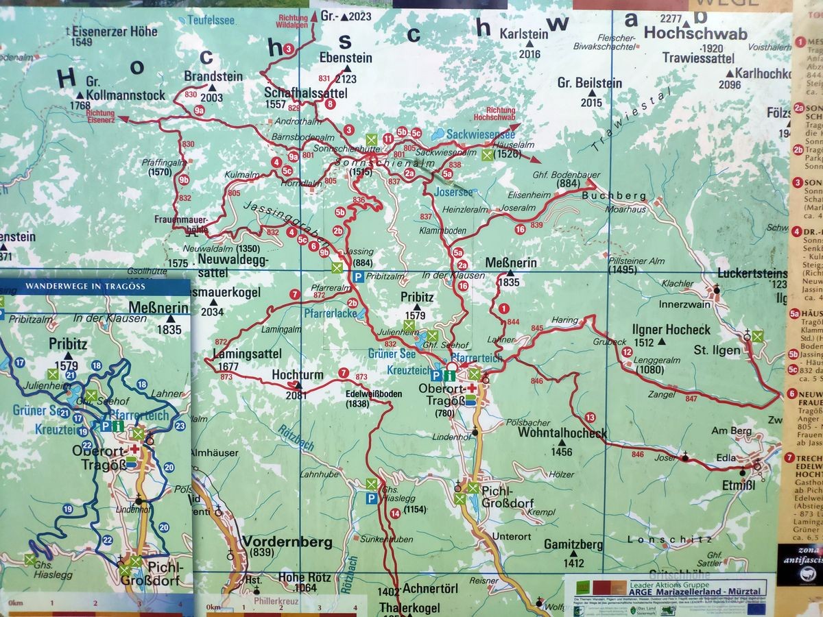 Der 2.123 Meter hohe Berg wird über den Normalweg von Jassing (Oberort-Tragöße) erreicht. In Summe sind es 18 Kilometer und 1.260 Höhenmeter bis zum Gipfel und wieder retour.