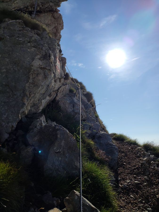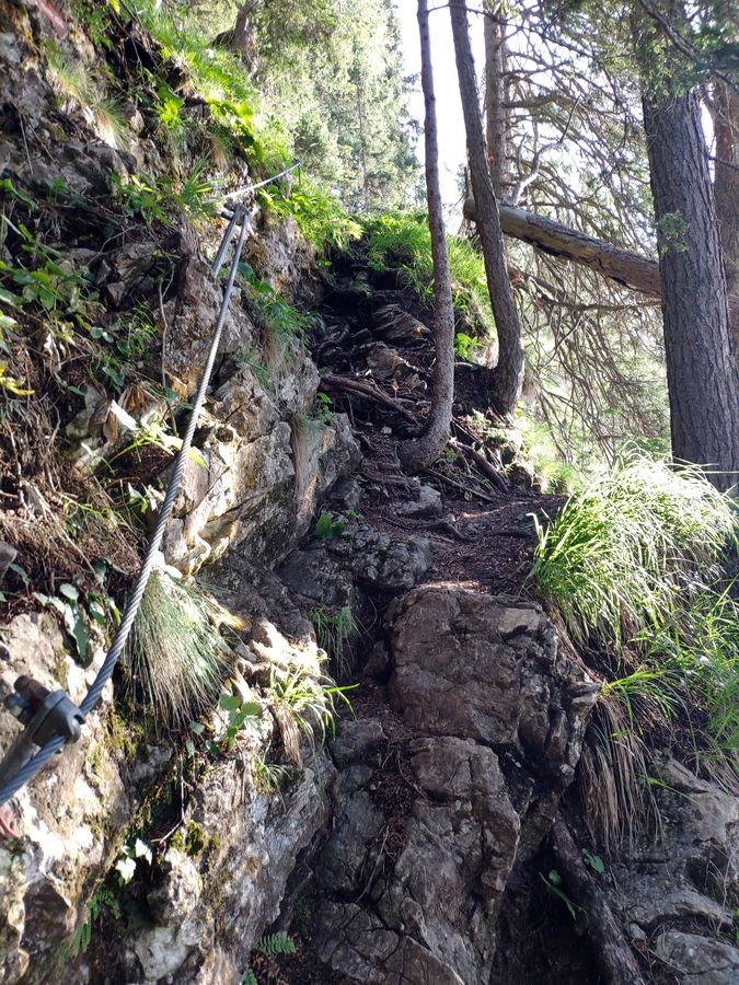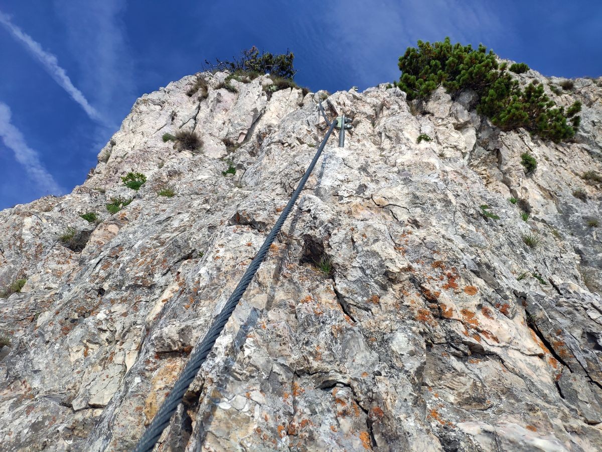 Der Klettersteig selbst hat einige luftige Stellen, ist aber für erfahrene Klettersteig-Geher kein Problem und kann bei guter Trittsicherheit ohne Klettersteig-Set begangen werden (meist nur kurze Passagen mit Fixseilen), dazwischen Gehgelände.