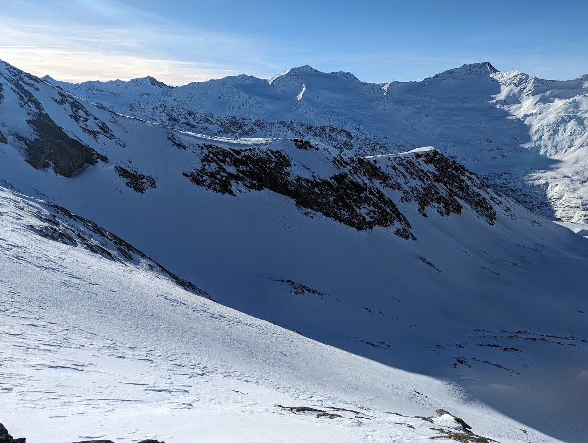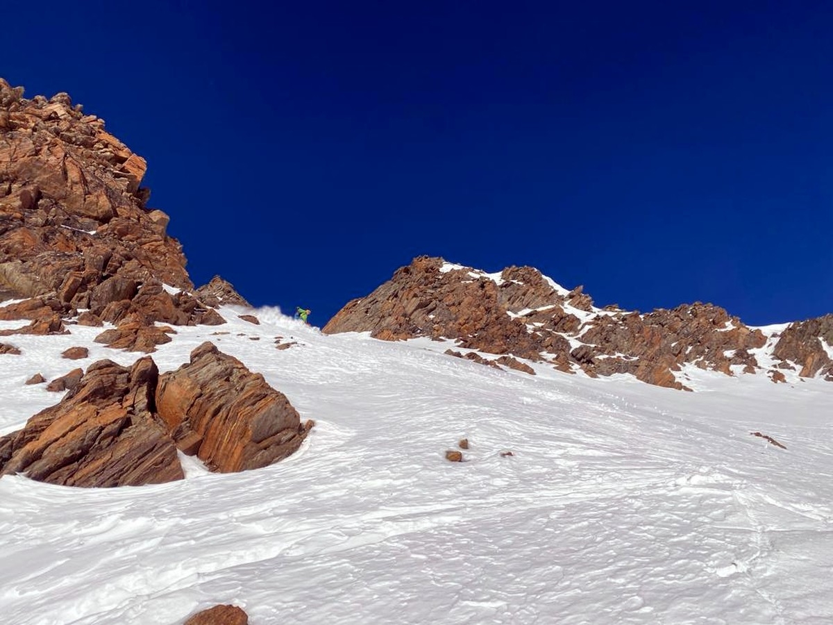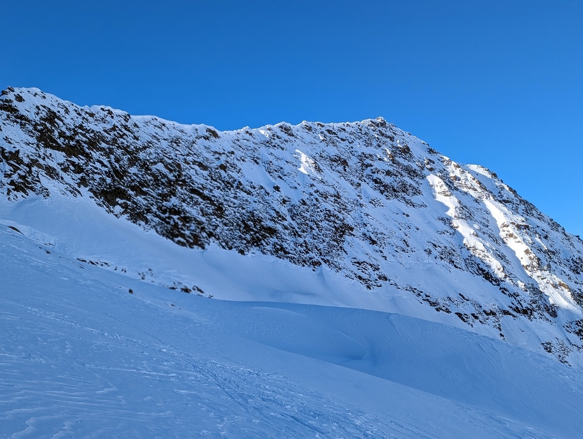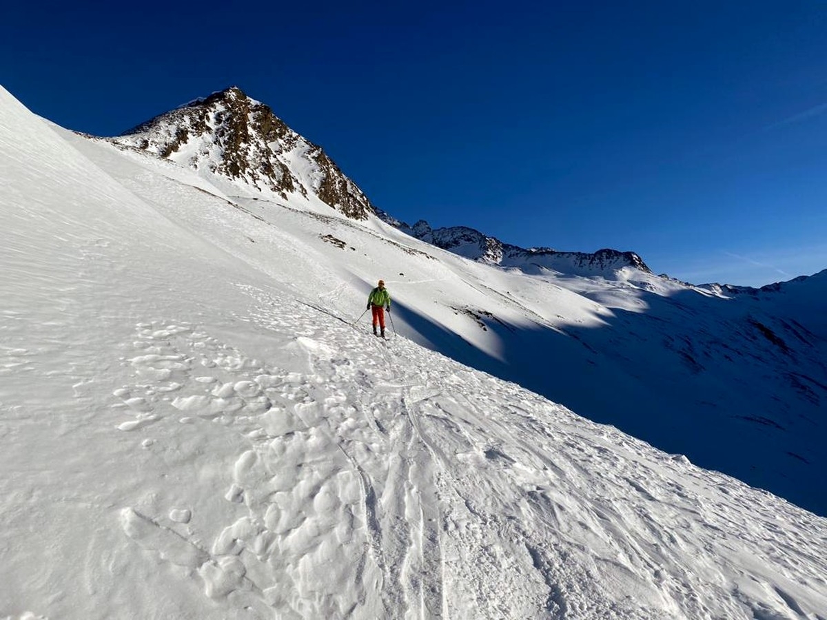- Vom Eiskögele-Gipfel wandert man normalerweise am Grat nun zurück, um dann von der Scharte west- oder nordseitig abzufahren. Allerdings gibt es eine deutlich spannendere Option. Dazu werden die Ski direkt am Gipfel angeschnallt und im flachen Terrain kurz Richtung Südwesten gefahren, bis eine steile Rinne (40 - 45°) erreicht wird.