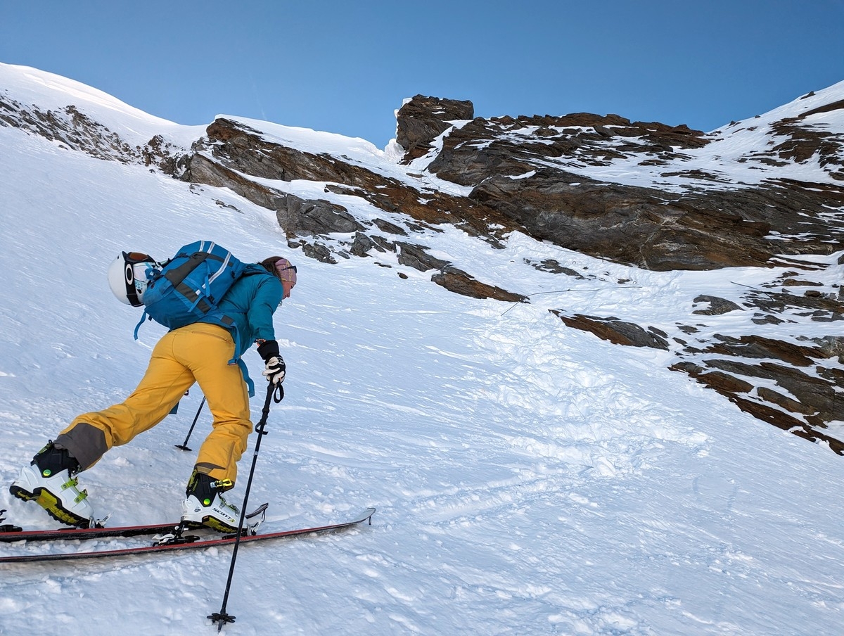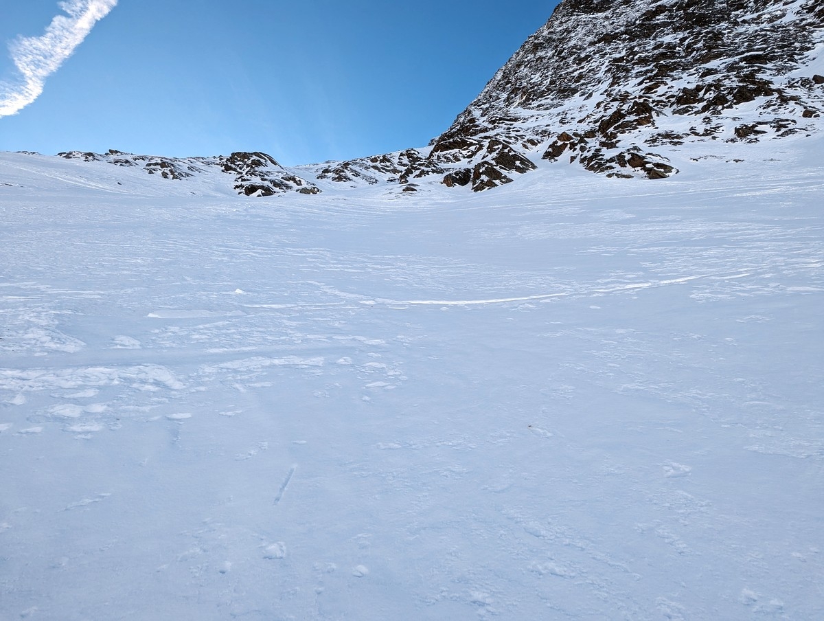 In der Abfahrt ist die Steilrinne direkt nach dem Gipfel die Schlüsselstelle. Der restliche Abschnitt ist flach und angenehm zu fahren.