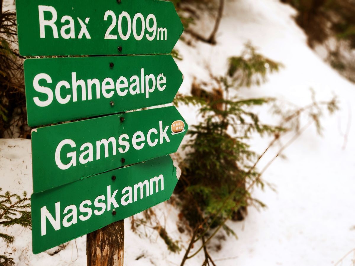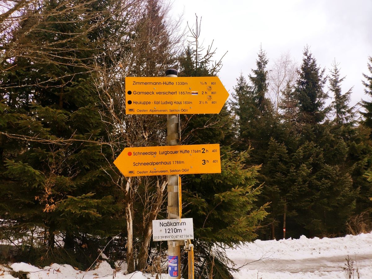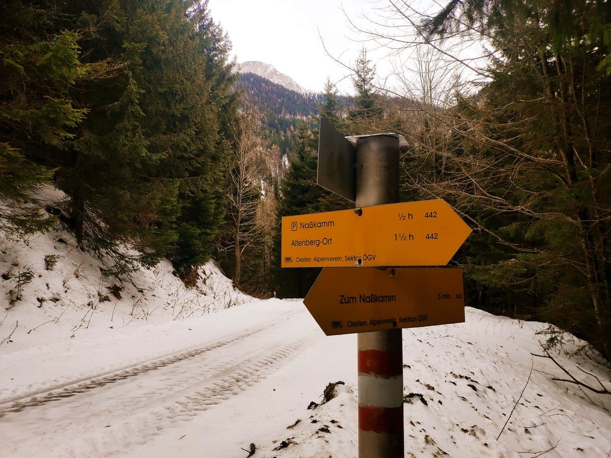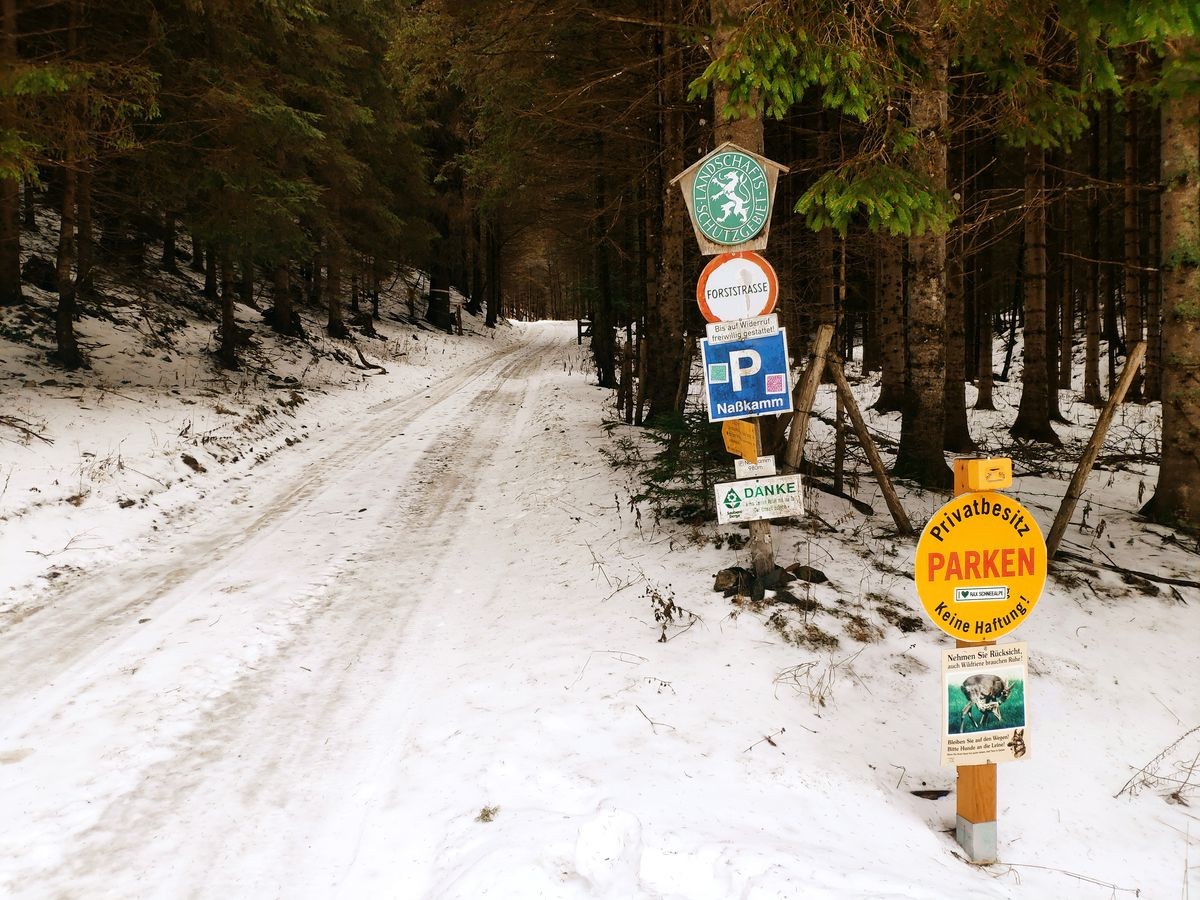 - Start beim Parkplatz "In der Nass" am Ende der Straße von Altenberg an der Rax. Im Winter ist der letzte Kilometer (ab Haus Nassbauer) nicht geräumt. Demnach wird die Tour bereits etwas früher gestartet, ca 500 Meter vor dem Haus.bei einer Parkmöglichkeit an einem Holzplatz.