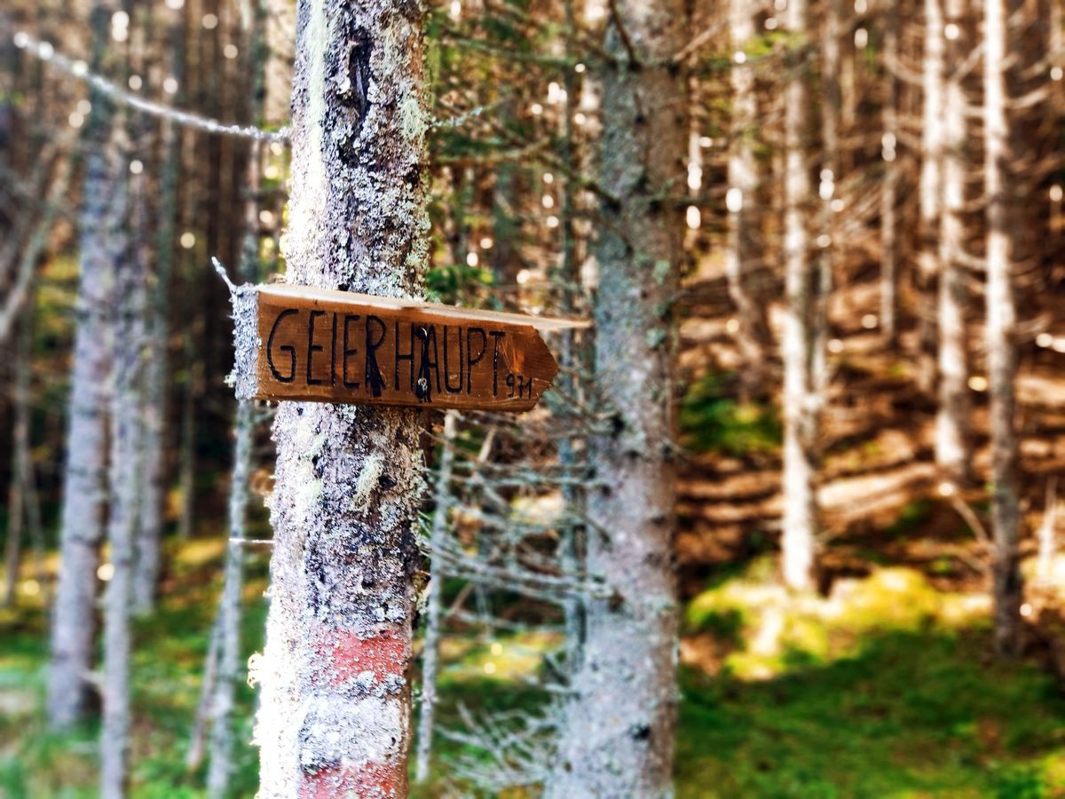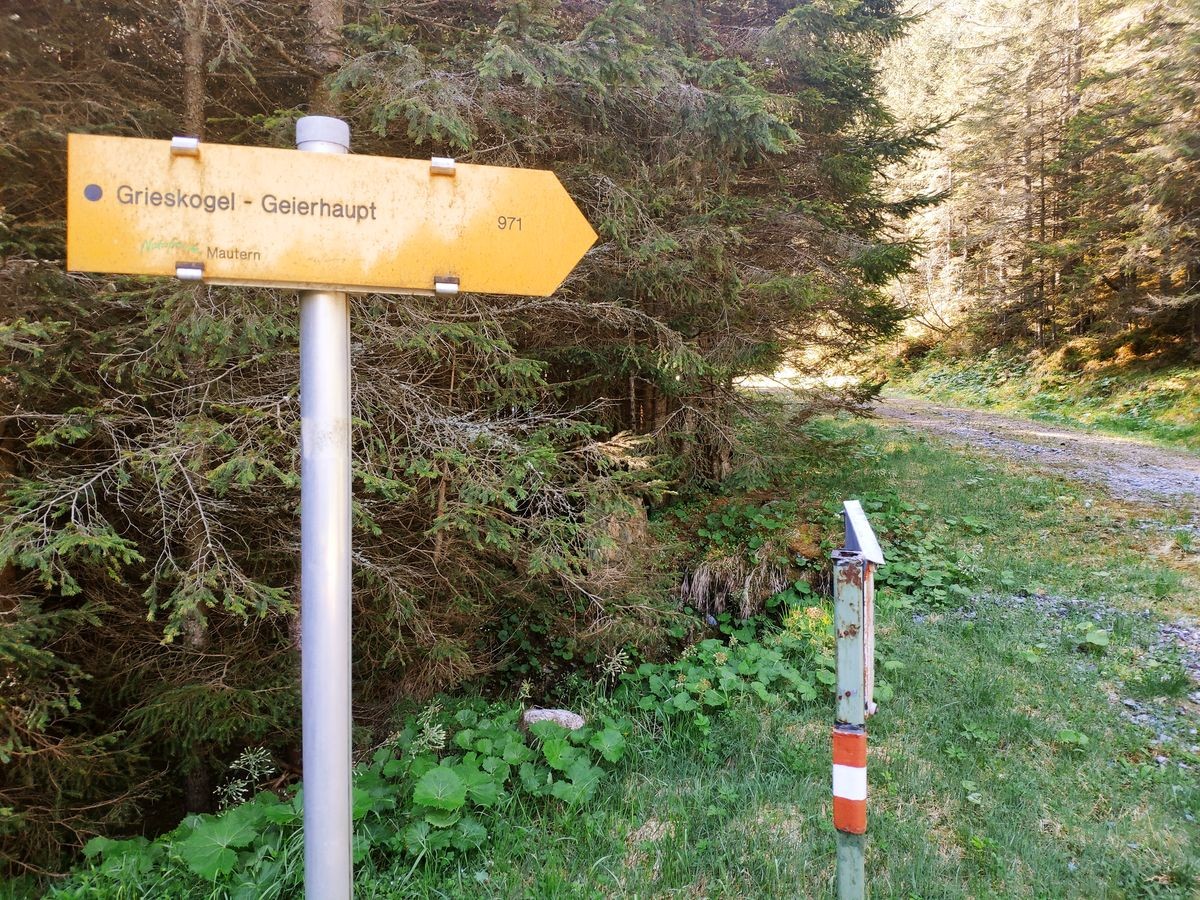 - Dem Forstweg so lange folgen bis eine Abzweigung nach rechts in den Wald Richtung Geierhaupt und Grieskogel führt. Dieser folgen.