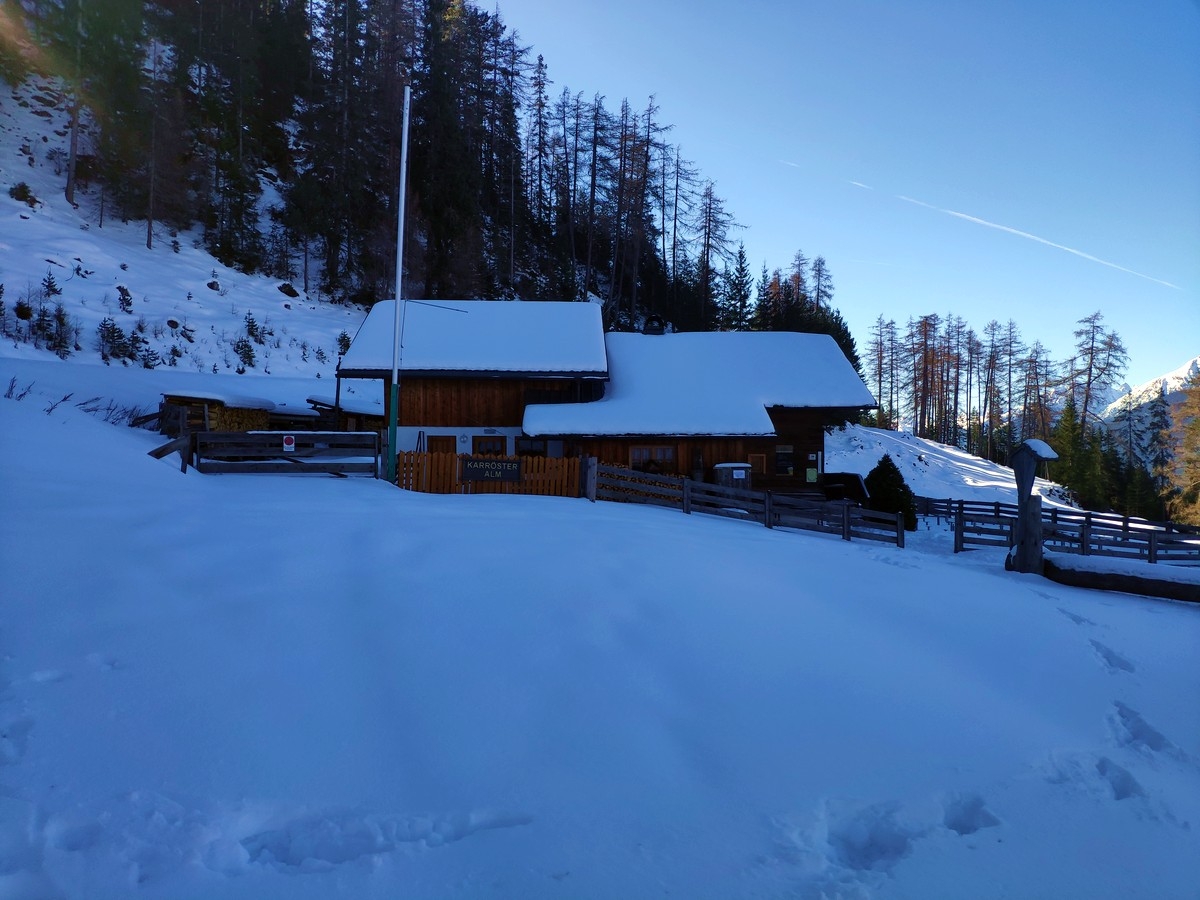 Verpflegung je nach Fähigkeiten einplanen. Im Sommer gibt es mit der Karröster Alm eine Einkehrmöglichkeit.