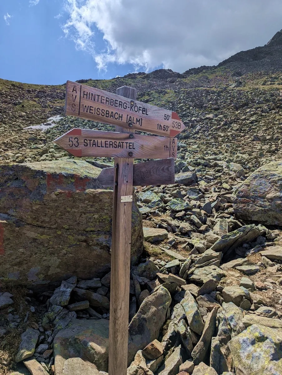 - Auf rund 2.500 Metern erreicht man unterhalb der Halsscharte eine Beschilderung. Dort an der Weggabelung rechts halten – Richtung „Hinterberg-Kofel (50 Minuten)“.
