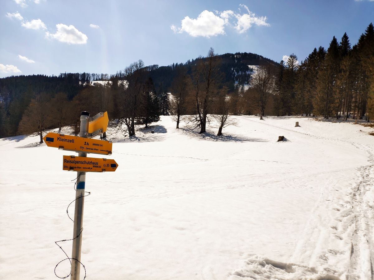 - Nun von der Reisalpe wieder auf selbigen Weg bis kurz nach die Kleinzeller Hinteralm bis zu einem Wegschild (45 Minuten)