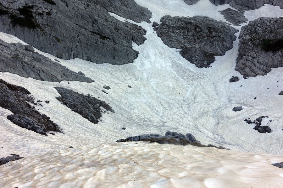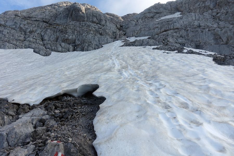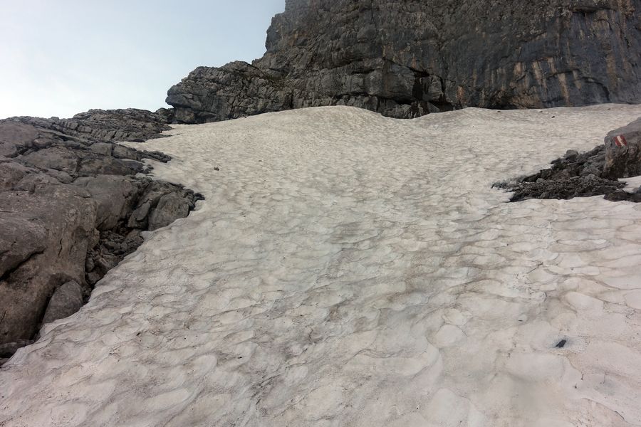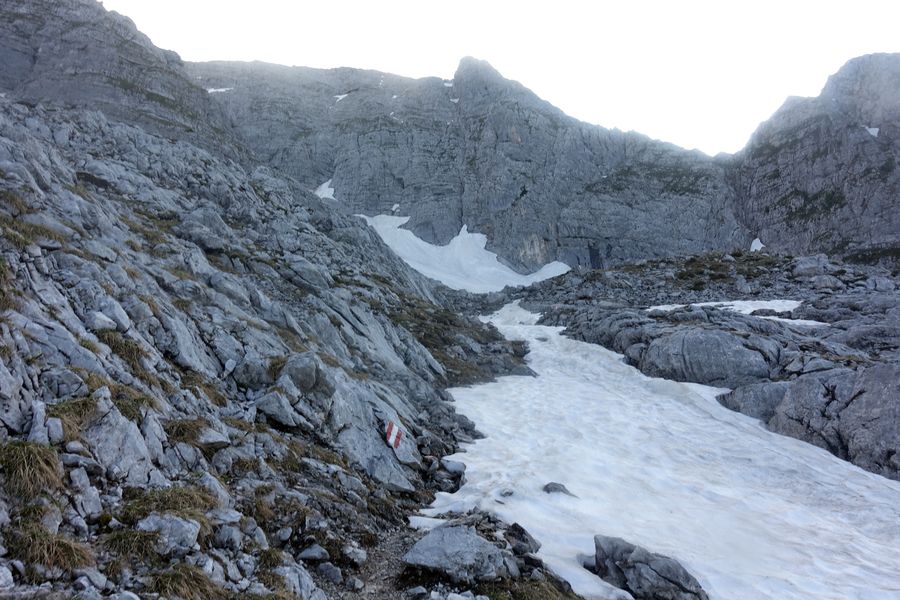 Nach dem Start beim Köblwirt in Johnsbach führt die Route anfangs durch Wiesen und Wälder an Kühen vorbei, bis man zur Abzweigung kommt, an der sich der Schneelochsteig vom Josefinensteig trennt. Nun geht es links dem Schneelochsteig entlang, auf dem sich nun sanfte Waldwanderwege langsam aber doch in Felsen und Geröll wandeln. Ziemlich früh führt die Route auch über die ersten Altschneefelder, die sich meist auch den gesamten Sommer halten - daher auch der Name Schneelochsteig. Meist hält man sich dabei links. Die Route ist allerdings durchgehend hervorragend markiert. Ein Verlaufen ist trotz Schneefelder nahezu unmöglich. Danach geht es über Serpentinen und Felsbänder (Schwierigkeit I bis I+) Meter für Meter Richtung Gipfel. Die Kletterpassagen sollten auch für Einsteiger keine unüberwindbaren Herausforderungen darstellen, erfordern aber Trittsicherheit und Konzentration.