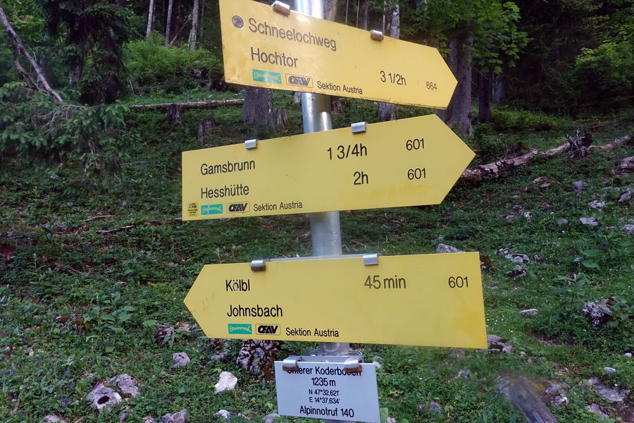 4,5 Stunden Aufstieg zum Hochtor / 2 Stunden Abstieg zur Hesshütte / 1,5 Stunden Aufstieg zum Hochzinödl / 1,5 Stunden Abstieg zur Hesshütte / 2 Stunden Abstieg nach Johnsbach