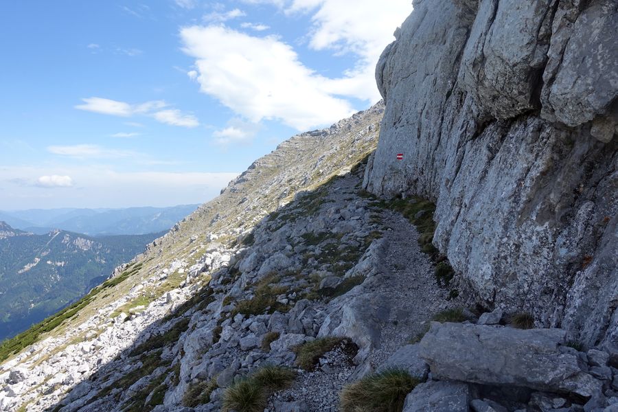 Ist der Gipfel des Hochtors erreicht, geht es nun über den markierten Josefinensteig bergab zur Hesshütte. Der luftige Abstieg (anfangs über den Grat) ist an den anspruchsvollen Stellen mit Drahtseilen versichert. Schwindlfreiheit ist aber auf diesem Abstieg ein absolutes Muss. Erst auf den letzten Metern Richtung Hesshütte wird es wieder gemütlich. Nun folgt auch der angenehmste Teil der Tour.