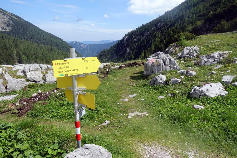 Ist die Hesshütte erreicht, kann man nun der markierten Route nach Johnsbach folgen oder noch einen kleinen Abstecher zum Hochzinödl (2.191 m) machen - ein Gipfel gegenüber des Hochtors. Der Anstieg über den Weg 662 wird auf 90 Minuten geschätzt, kann aber bei zügigem Tempo auch deutlich schneller gemacht werden. Bergab geht es über den etwas längeren Panoramaweg (61). Beide Wege sind technisch nicht anspruchsvoll. Über den Panoramaweg erreicht man nun wieder die Hesshütte, von der nun endgültig der ebenfalls einfache Retourweg nach Johnsbach folgt.