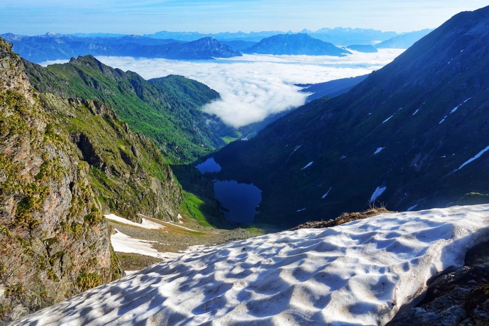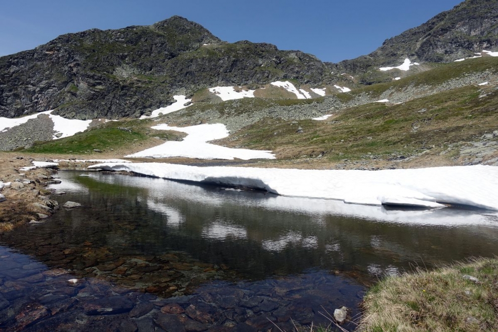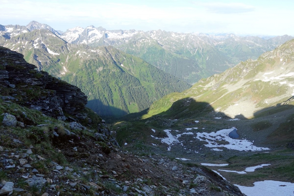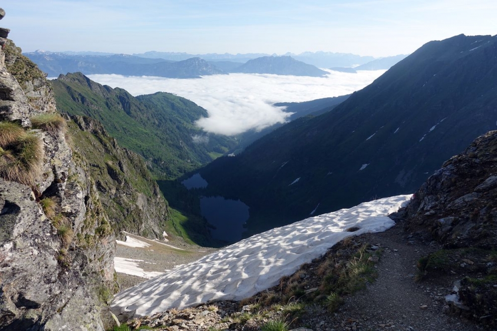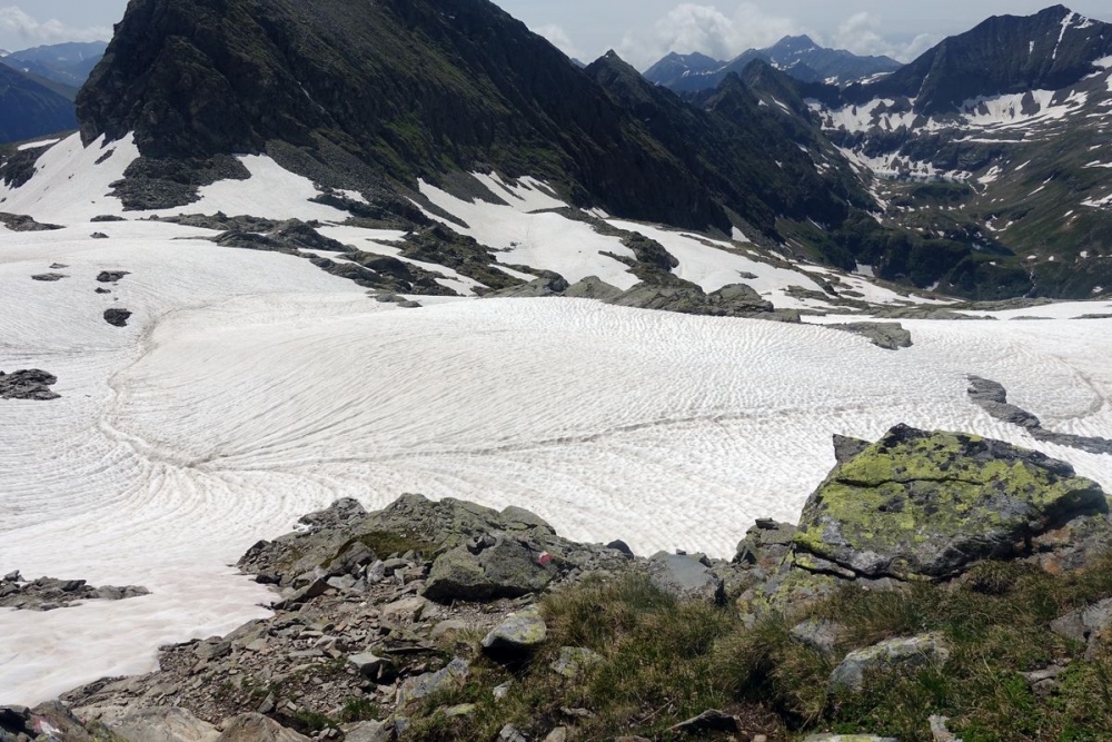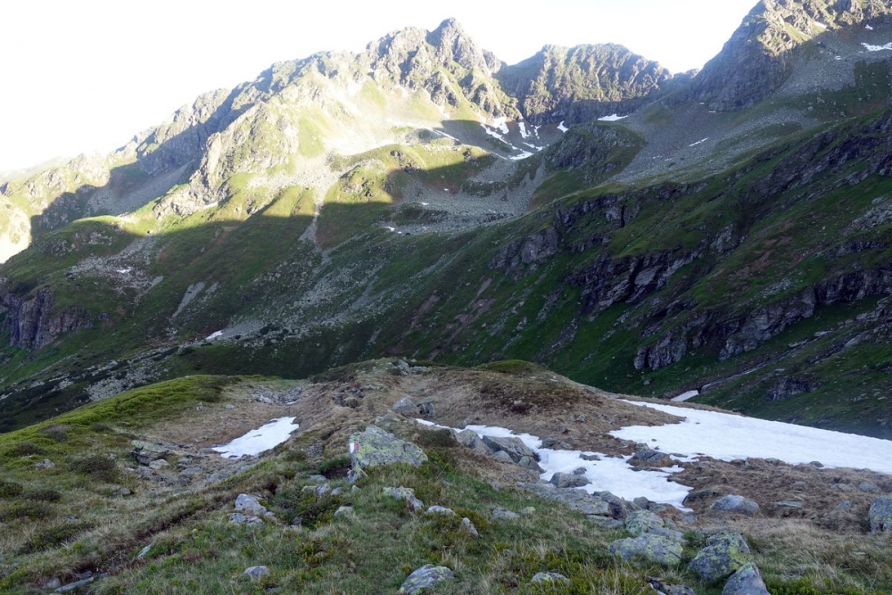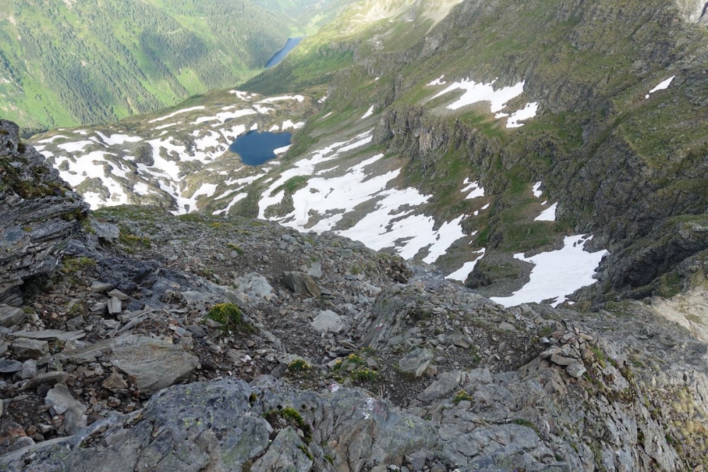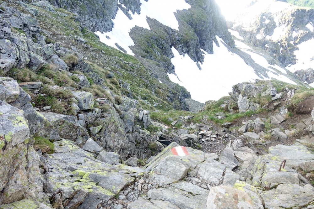 Doch auch der anspruchsvolle Abstieg ist geschafft. Nun hält man sich links und wandert durch das (hier noch) Schneefeld