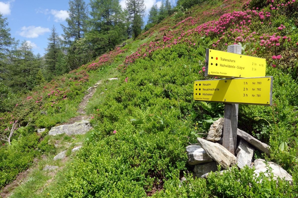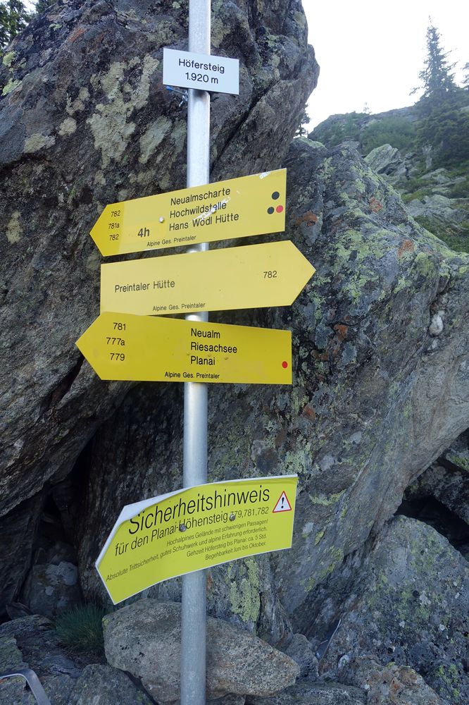 Dei veilen Schilder könnten durchaus verwirren. Nun geht es auf dem Weg 782 zur Neualm Scharte