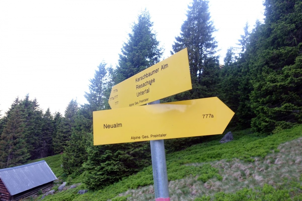 Mit dieser Markierung endete aber die gemütliche Jogg. Nun geht es links in die Wiese den Weg 777a zur Neualm. erei