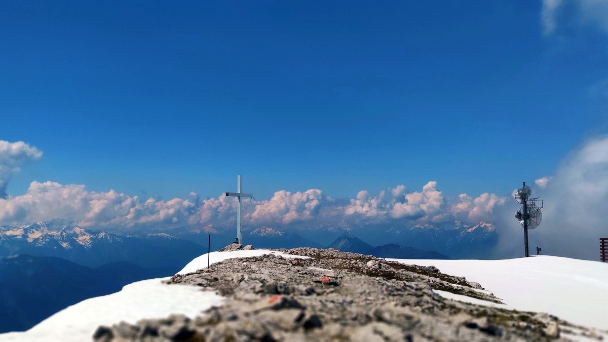- Nach insgesamt 5,5 Kilometern wird auf 2.592 Metern Höhe der Hohe Munde Ostgipfel erreicht.