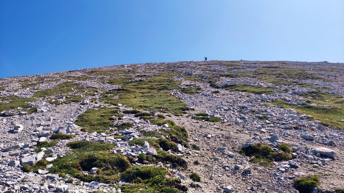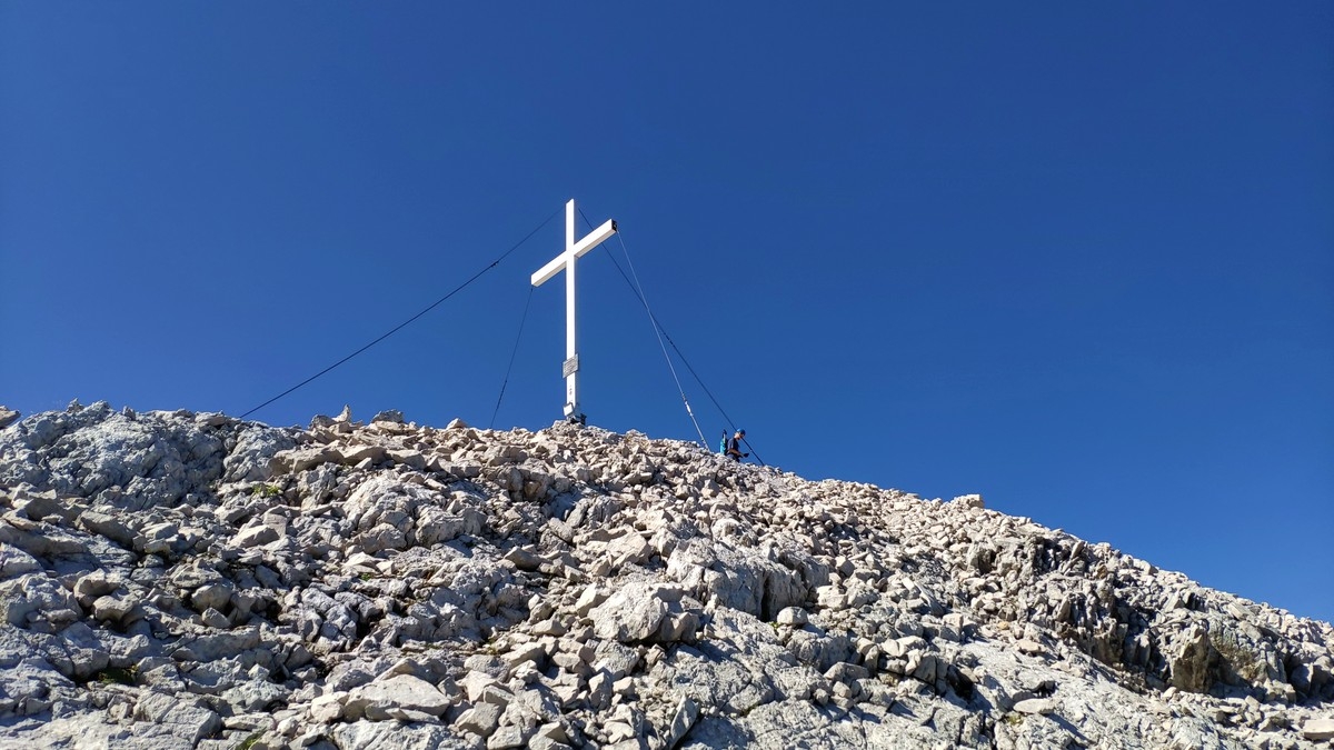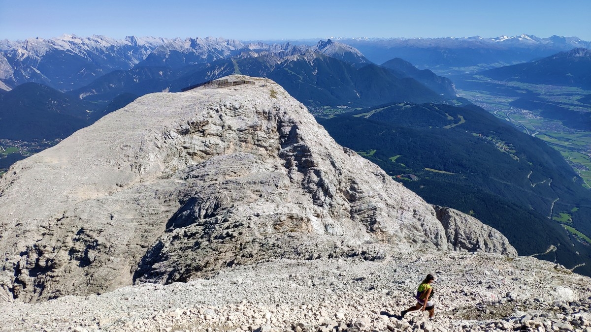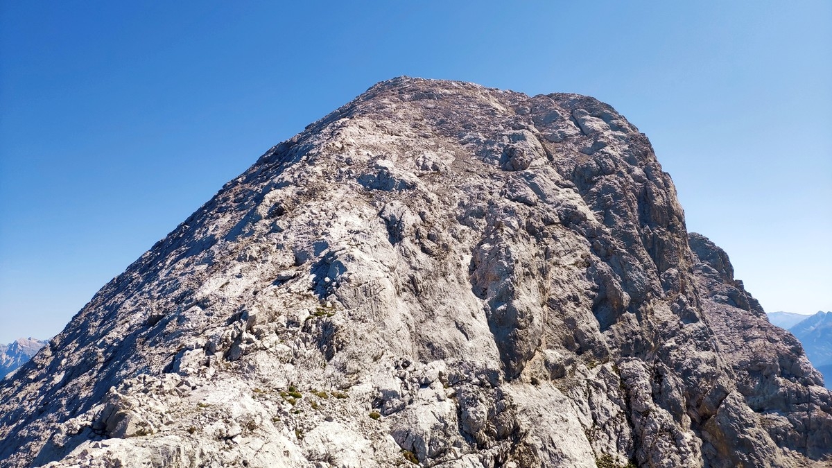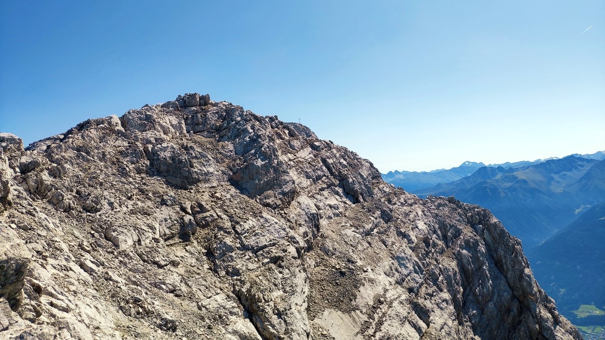 - Vom Hohe Munde Westgipfel bergab und mit einem kurzen Zwischenaufstieg zum Hohe Munde Ostgipfel auf 2.592 Metern Höhe.
