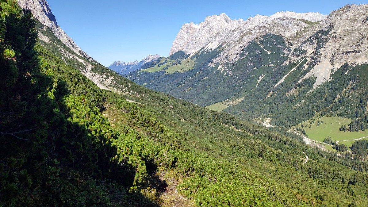 - Von dort Richtung Norden zunächst über eine Forststraße, danach über einen einfachen Wanderweg wieder bis zu den Parkplätzen bei der Leutascher Ache gehen.