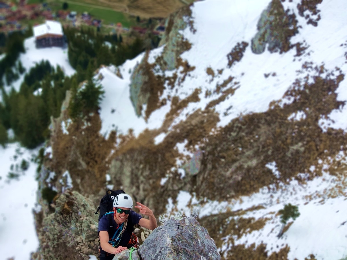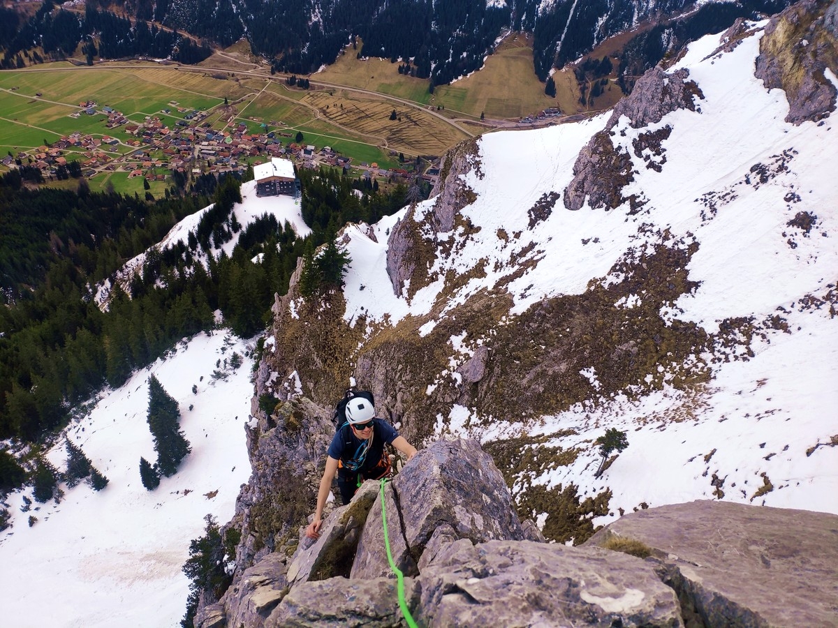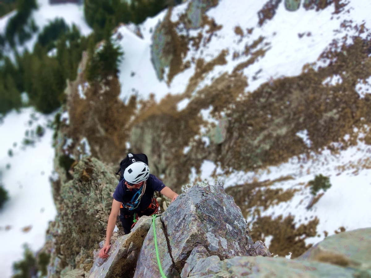 - Die 5. Seillänge (25 Meter) zuerst links über eine Kante und danach auf dem Grat bis zum Ende des Hüttengrates (UIAA 3). Mit einem 50-Meter-Seil könnten die letzten 2-Seillängen kombiniert werden.