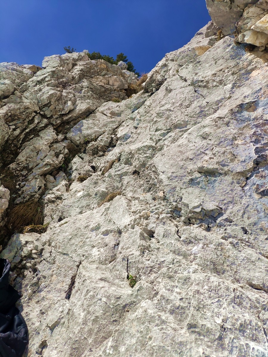- 3. Seillänge (30 Meter) zunächst über eine Platte (4+) danach links um eine Kante und danach wieder rechts (3 - 4) und kurz über Gras bis zum Standplatz.