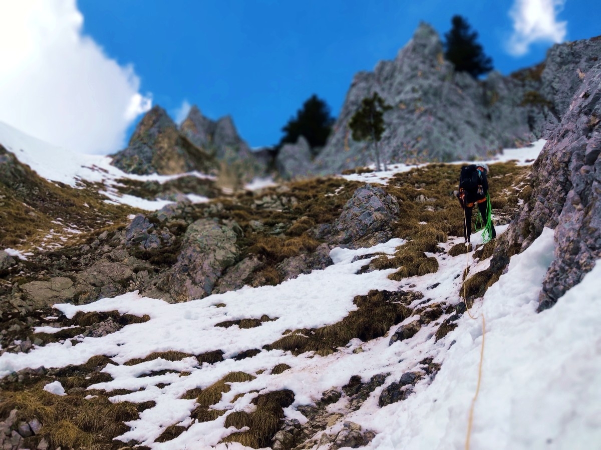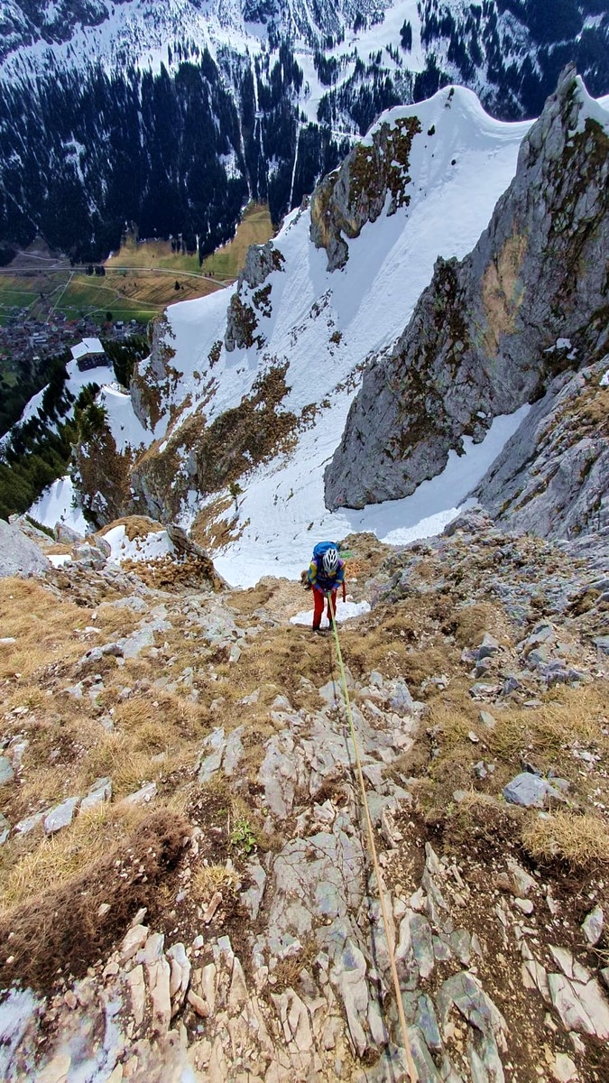 - Oben angekommen befindet sich 20 Meter vom Grat entfernt der Abseilstand. Abseillängen: 40 Meter + 45-50 Meter + 40-45 Meter