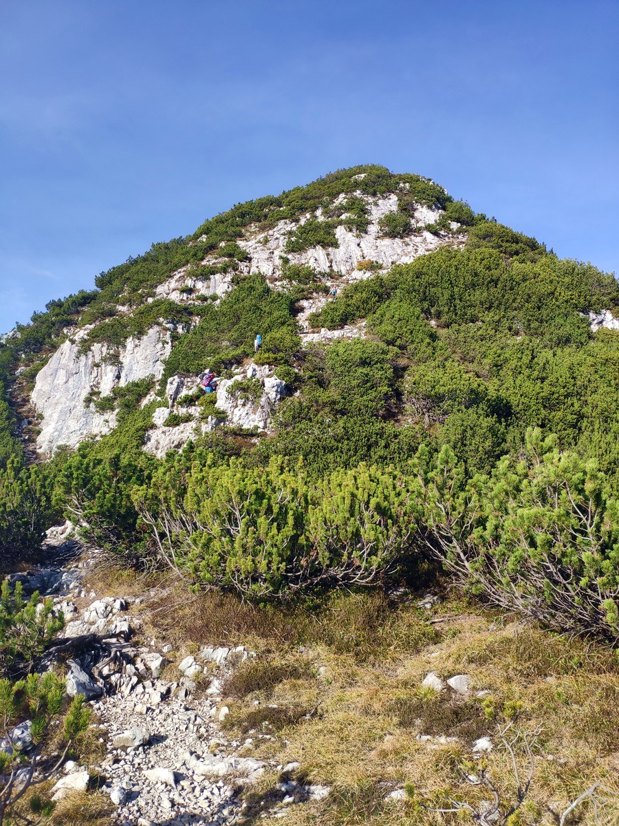 - Kurz vor dem Gipfel zweigt ein Weg nach rechts ab, welcher zum Klettersteig führt. Nun entweder wahlweise links den direkten Weg über den Ostgrat (UIAA 1) zum Gipfel nehmen oder rechts den Hundskopf umrunden, und vom Norden über den Klettersteig (B) aufsteigen.