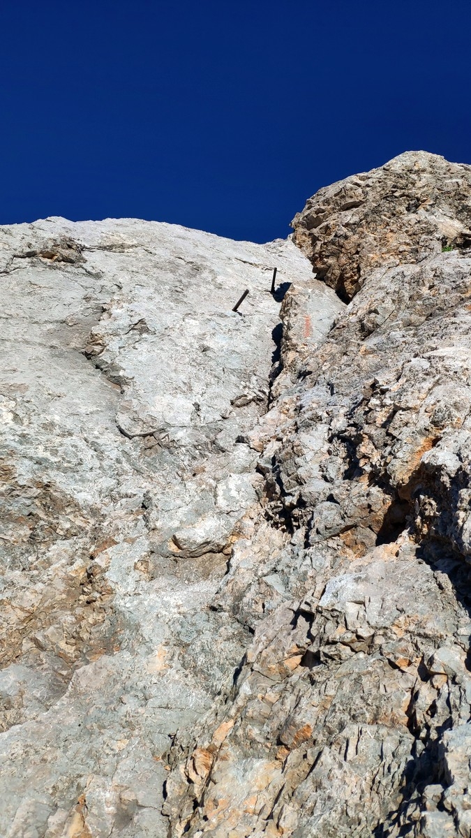 - Im zweiten Abschnitt ab der Abzweigung zur Knorrhütte (Notabstieg) dominieren Klettersteige, die immer wieder durch freie Kletterstellen unterbrochen werden.