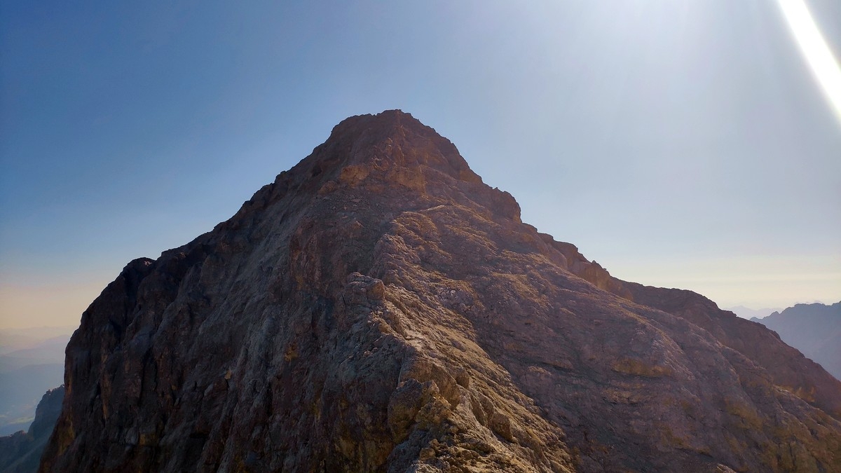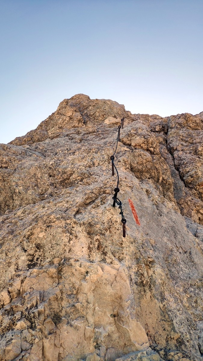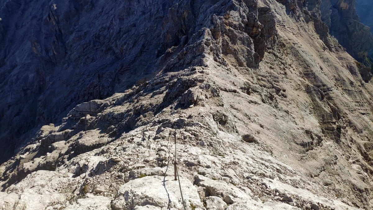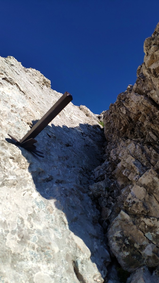 Klettertechnische Schlüsselstelle ist sehr früh eine glatte Rinne (3-) die bergab geklettert werden muss (3 Eisenstifte unterstützen).