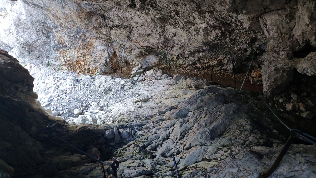 - Klettertechnisch am anspruchsvollsten ist sehr früh bereits eine glatte Rinne (3-), die bergab geklettert werden muss. Drei Eisenstifte erleichtern das Abklettern etwas.