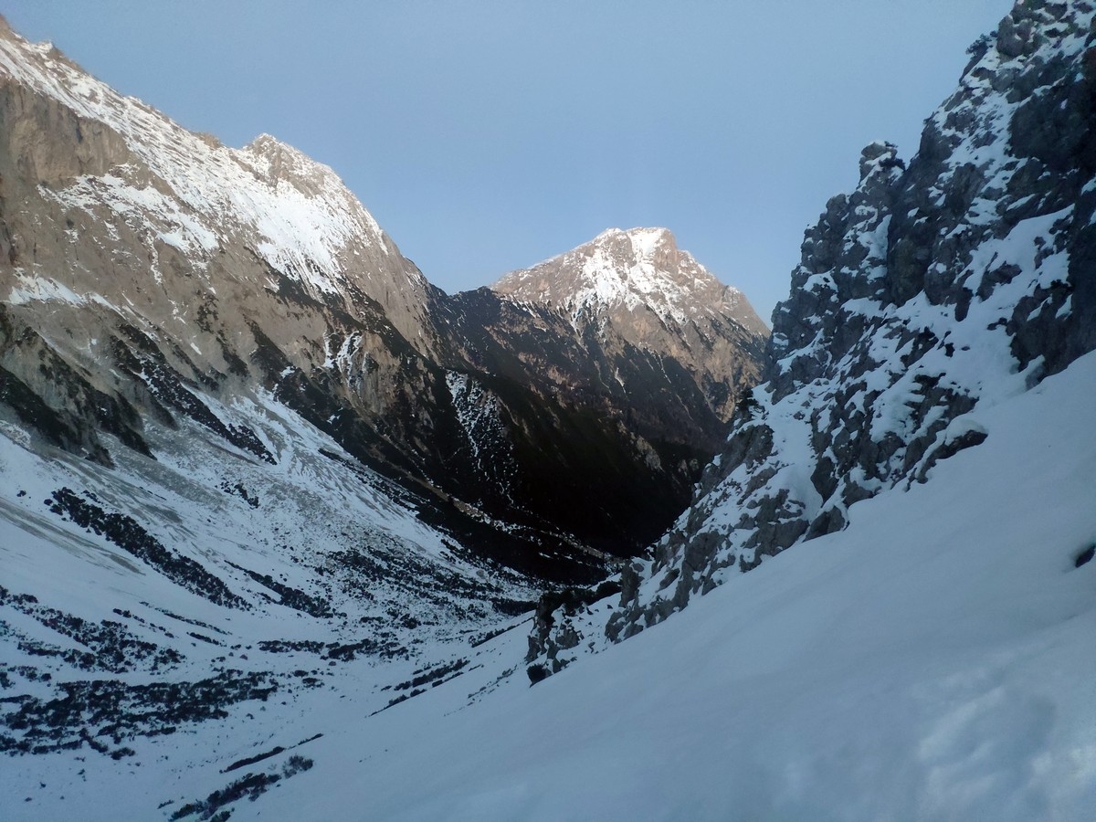 Als Skitour ist bei ausreichend Schnee die Abstiegsroute auch im Aufstieg sinnvoll, da sich dort bis zum Judentörl der Schnee sehr gut hält.