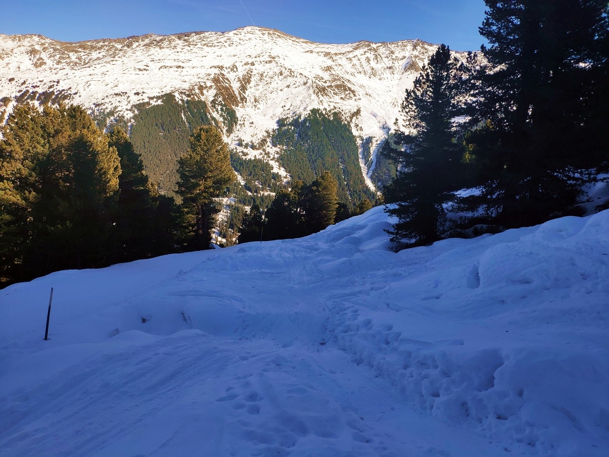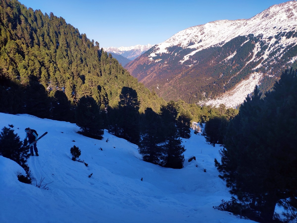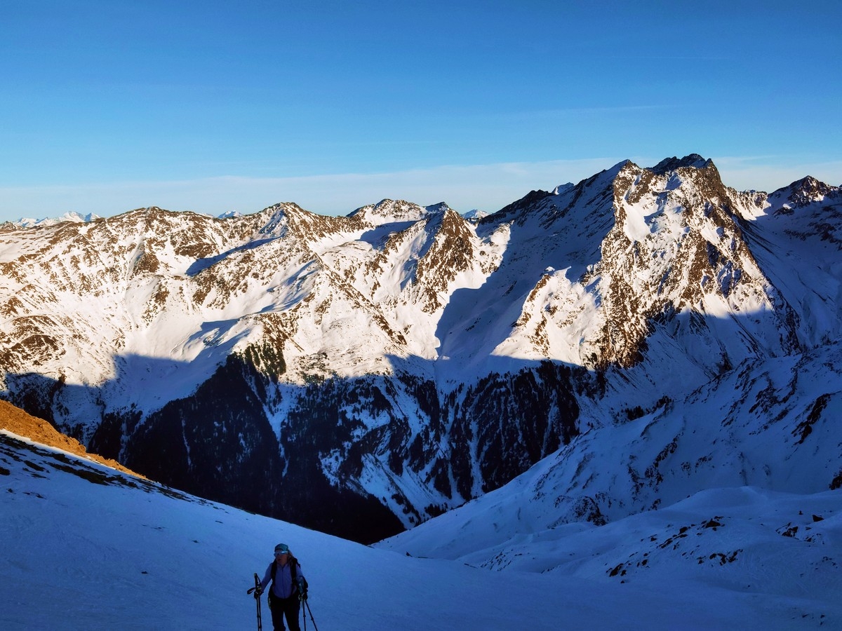 Rund 1.200 Höhenmeter im Aufstieg, ohne starke Neigungen und daher kaum lawinengefährdet. Bei mäßiger Schneelage ist die schattenseitige Route aber möglicherweise vereist und daher anspruchsvoller.