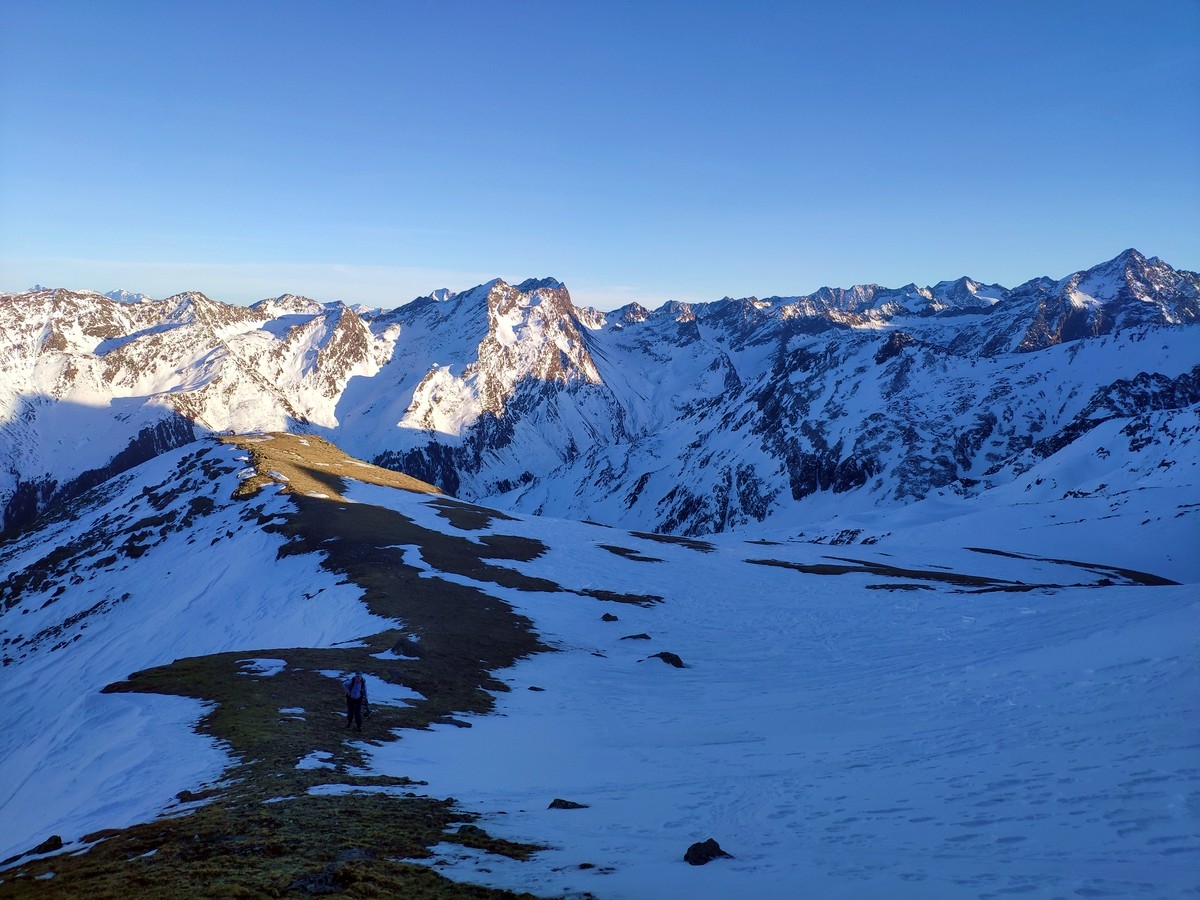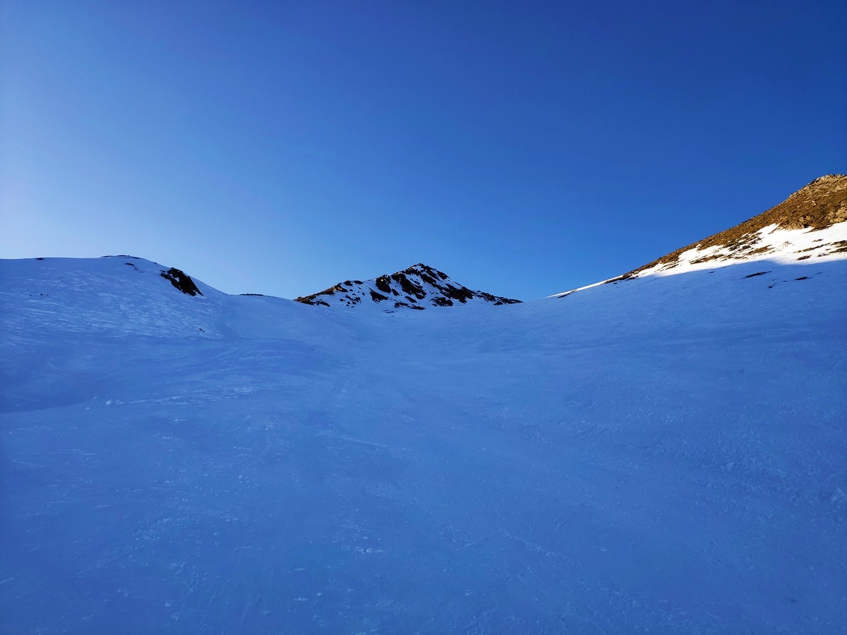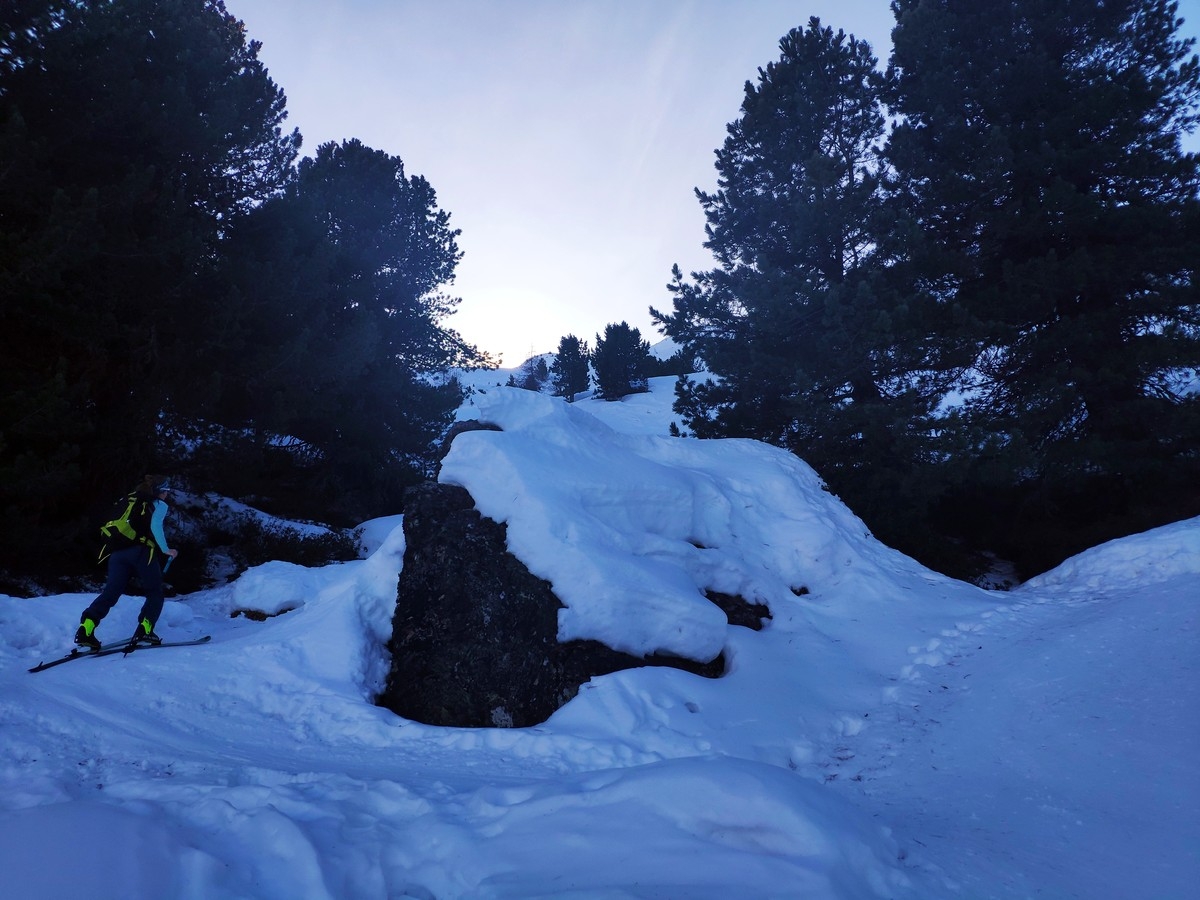 Rund 1.200 Höhenmeter im Aufstieg, ohne starke Neigungen und daher kaum lawinengefährdet. Bei mäßiger Schneelage ist die schattenseitige Route aber möglicherweise vereist und daher anspruchsvoller.