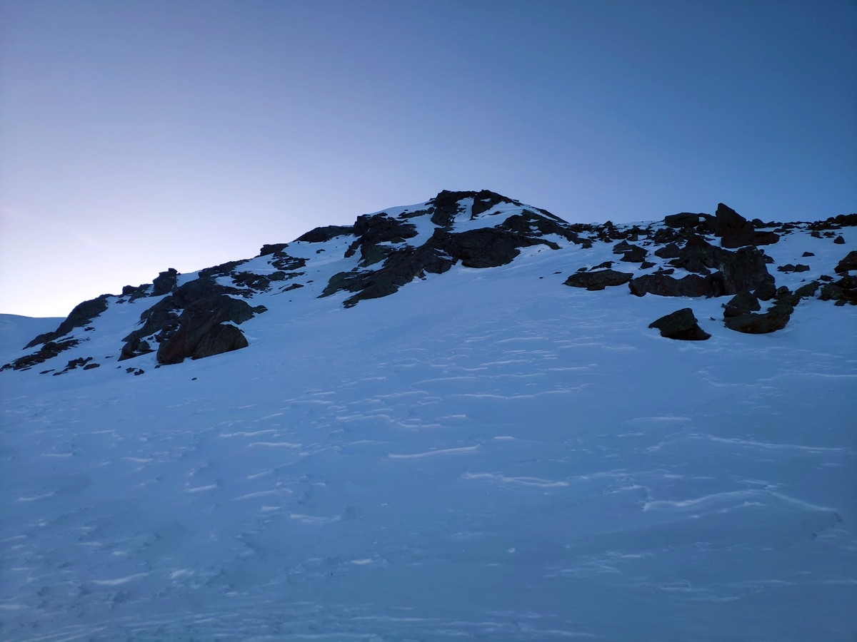 - Etwa 100 Höhenmeter unter dem Gipfel Skidepot und danach auf entweder links oder rechts über den Grat (Gehgelände) auf die Lampsenspitze. Links die klassische Route, rechts etwas direkter und kürzer. Beides wenig anspruchsvoll.