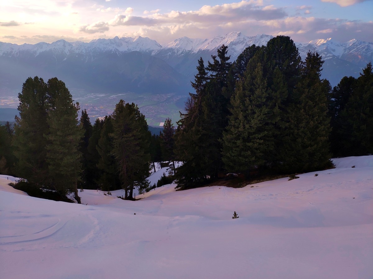 - Abstieg wie Aufstieg, Alternativ kann ab der Alm auch die Forststraße genommen werden, die sich später im Winter in eine Rodelbahn (links) und eine Skitourenroute (rechts) zweigt.