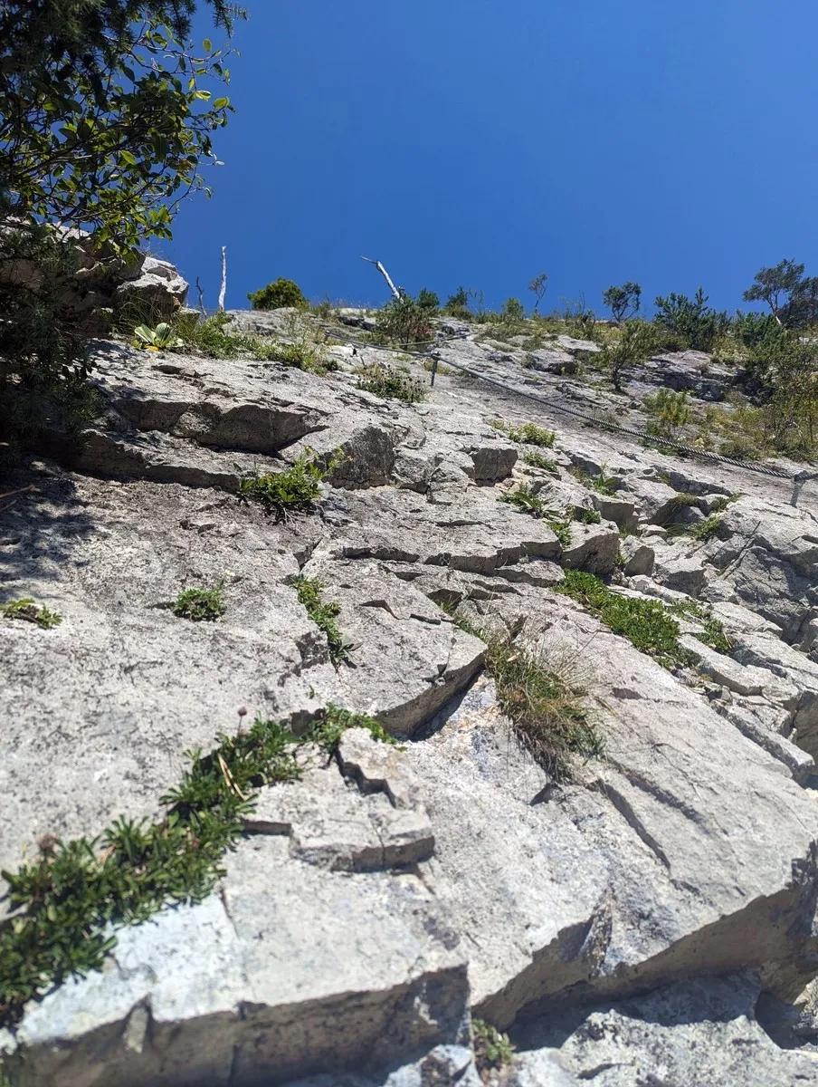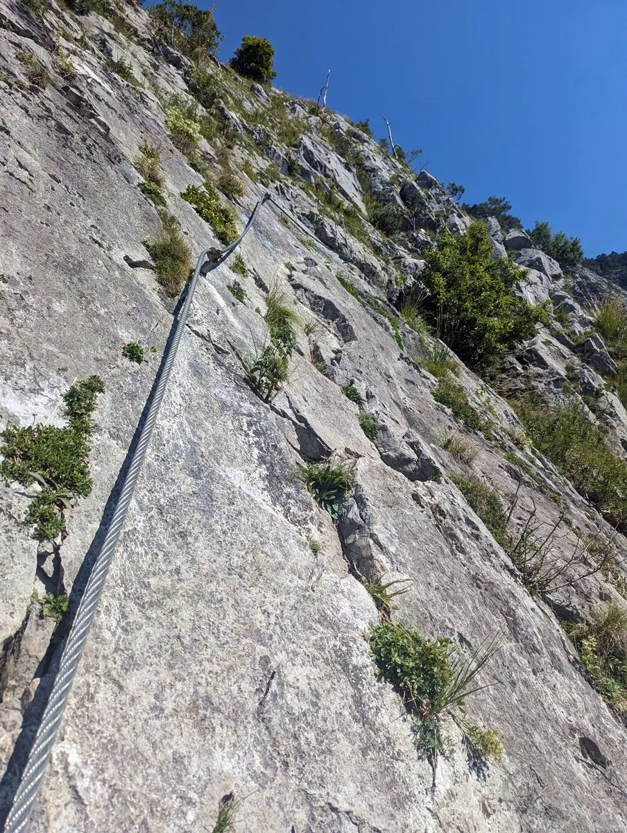 • Kurz nach dem Info-Schild mit den eingezeichneten Kletterrouten und dem eingezeichneten Klettersteig bei der ersten Abbiegung links gehen (kann leicht verpasst werden), ehe bei einigen Sträuchern bzw. kleinen Bäumen der Klettersteig beginnt.