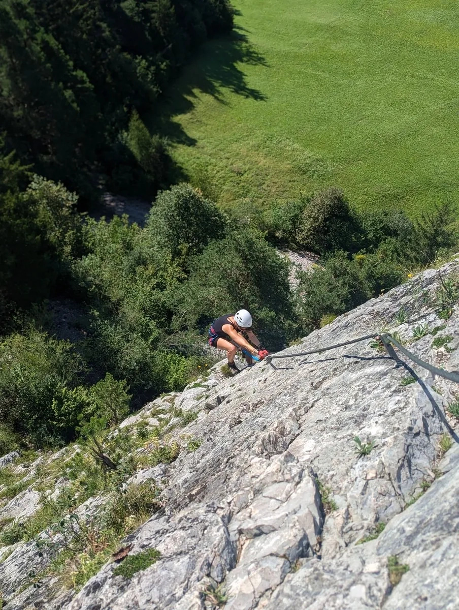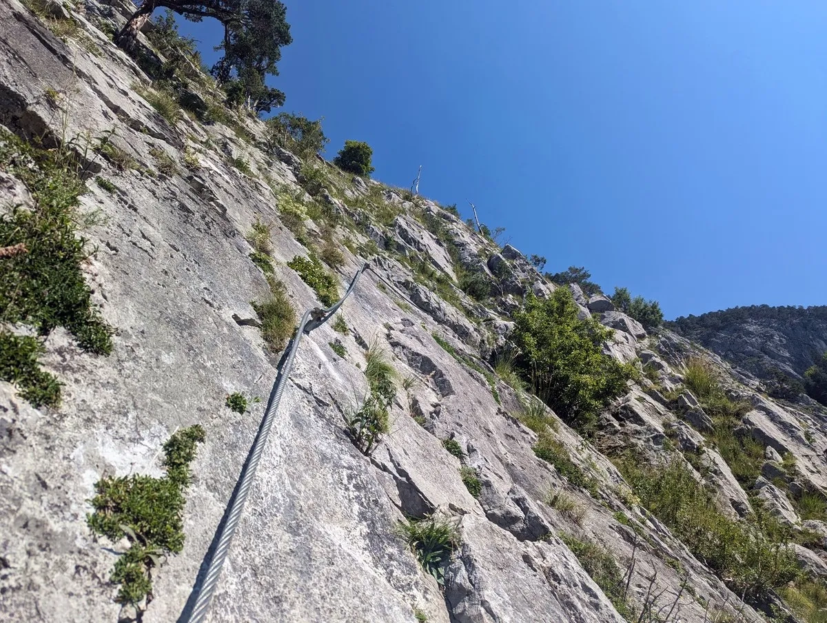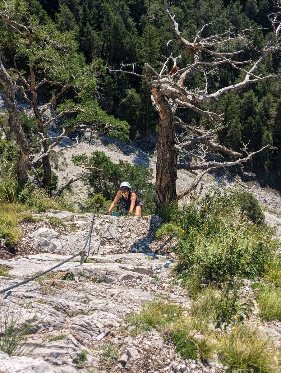 Die Steinschlaggefahr durch Klettersteig-Geher oberhalb ist ein zusätzliches Sicherheitsrisiko.