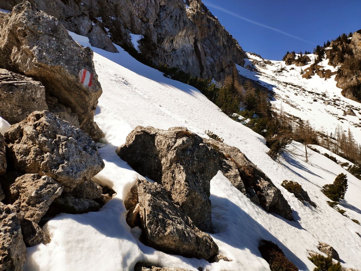 Lugauer Überschreitung 12: Ab und zu sind auch bei Schnee ein paar Markierungen zu sehen