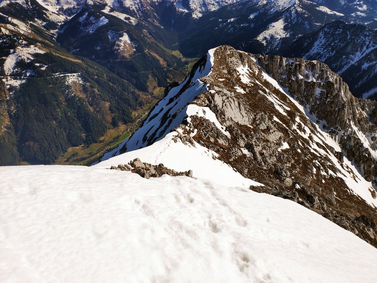 Lugauer Überschreitung 34: Nun geht es teilweise durch den Schnee am Grat entlang bergab