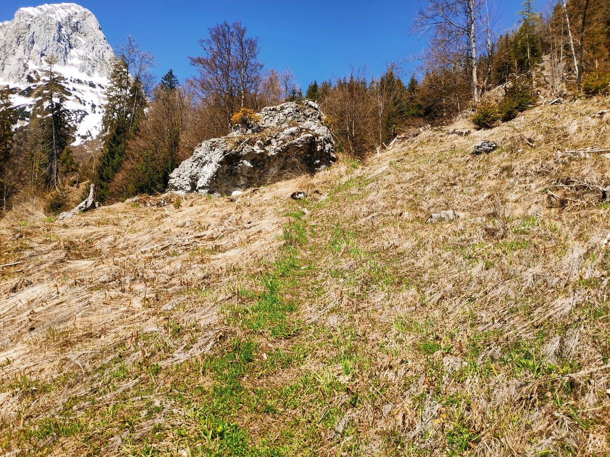 Lugauer Überschreitung 11: Es gehet nur den Hang bergauf. Man hält sich dabei meist relativ weit links am Felsen (Achtung: Leichte Steinschlaggefahr)