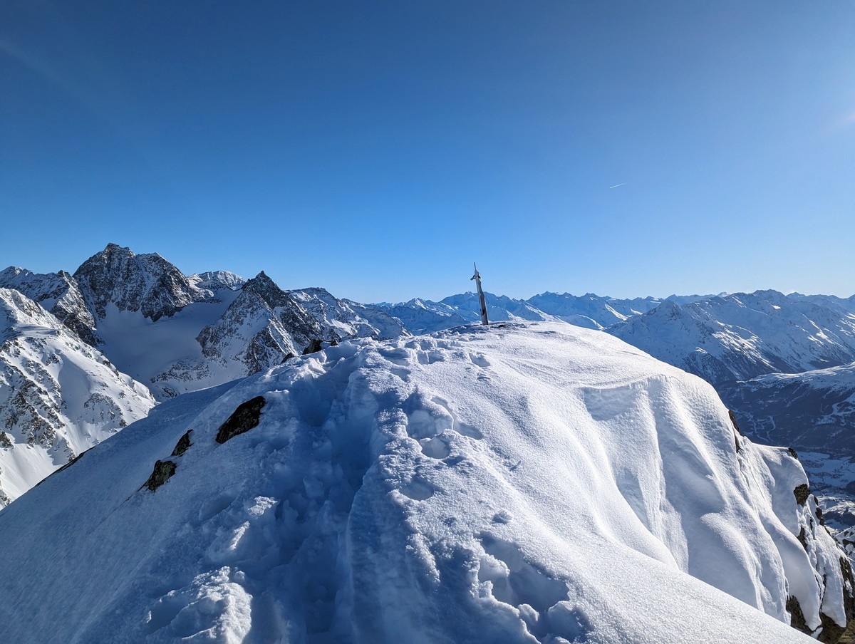 - Ski-Depot kurz unterhalb des Gipfels und zu Fuß in wenigen Minuten zum Gipfel. Normalweise werden dafür keine Steigeisen benötigt.