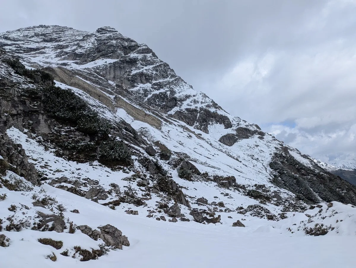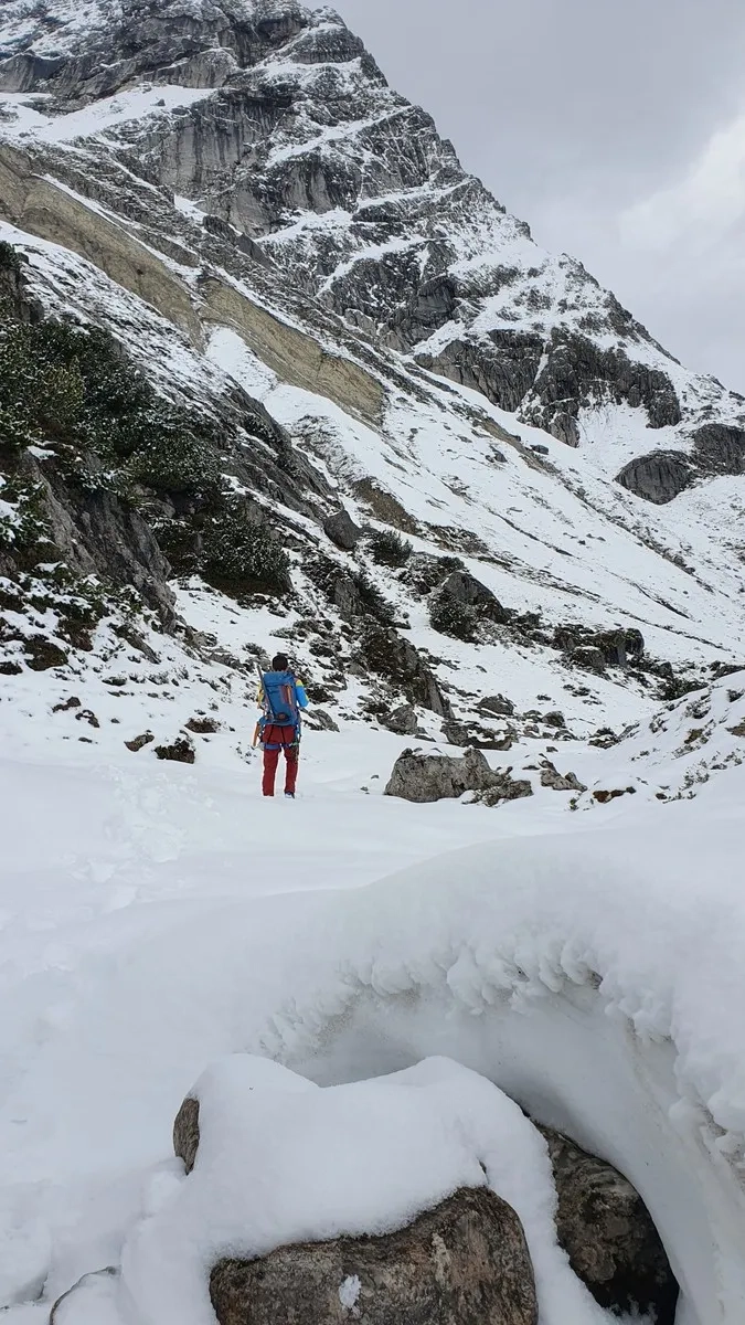 Im Frühling benötigt man bei Schnee Eispickel und Steigeisen.