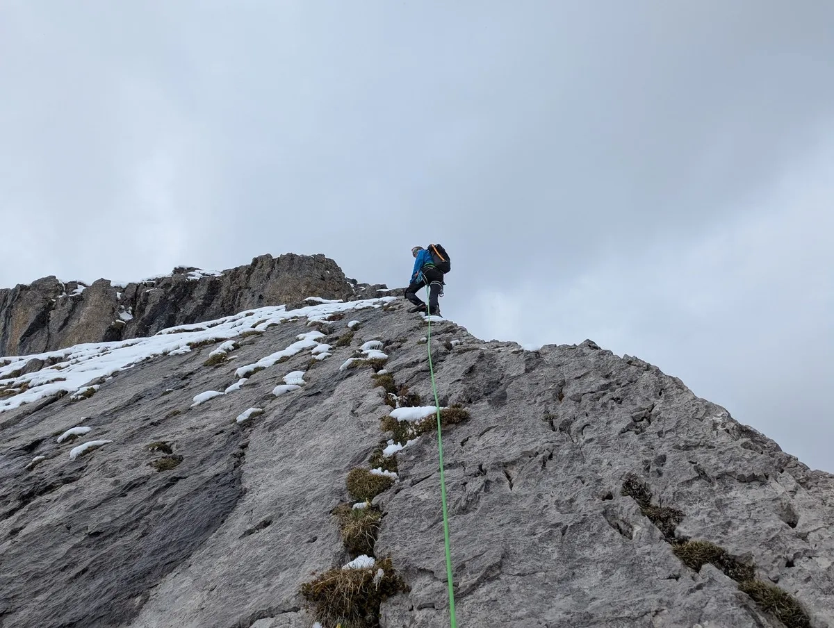 - Der Grat beginnt mit einem Aufstieg im Grasgelände, dann kommt die erste Seillänge – Schwierigkeitsgrad 1+, fast schon zum Warmlaufen. Wer möchte, geht seilfrei los.