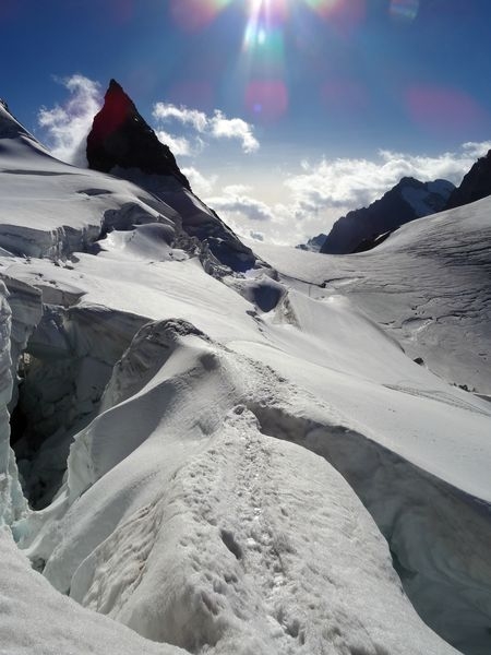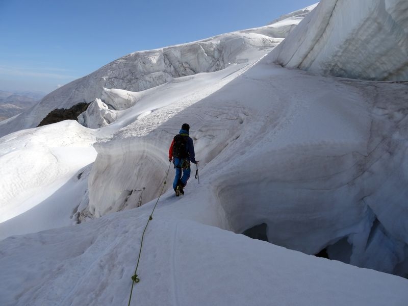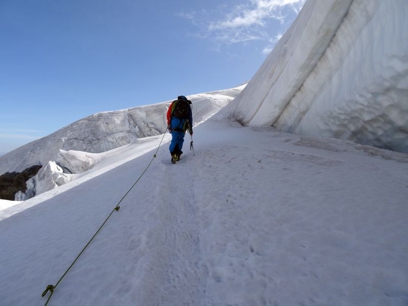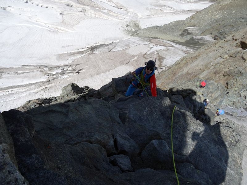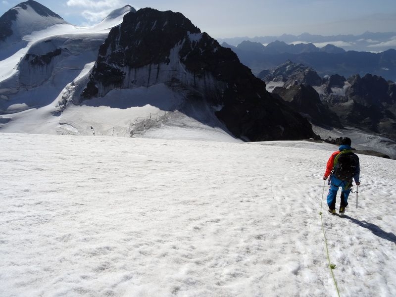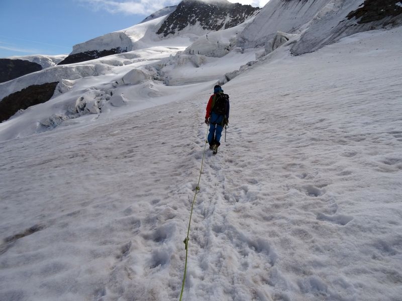 Wir wählten den Spallagrat (also die Zweitagestour), verzichteten aber auf Bahnunterstützung (Diavolezza) und wählten anfangs den direkten Weg auf den Morteratsch-Gletscher (anstatt rechts zur Bovalhütte aufzusteigen). Am Gletscher sollte man sich links halten. Danach ging es links in Kehren Richtung Isla Persa hoch. Richtung Bellavista Trasse, die auf etwa 3.700 Metern Höhe liegt, wird nun der Fortezzagrat (III) überschritten und lange den Gletscher bergauf gegangen. Ist die traumhafte Bellavista Terrasse erreicht sind rund 2.000 Höhenmeter Aufstieg geschafft. Nun geht es wieder etwas bergab zur Hütte Rif. Marco e Rosa, auf der auf über 3.600 Metern Höhe übernachtet wird.