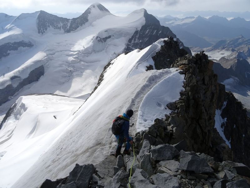 Nach dem Frühstück um 6 Uhr morgens folgen die letzten rund 450 Höhenmeter. Anfangs geht es den Gletscher wieder hoch, ehe der Einstieg zum Spallagrat (II+) folgt. Für diesen benötigt man etwa 1,5 Stunden bis zum Gipfel des Piz Bernina. Der Spallagrat ist deutlich länger als der Fortezzagrat, von der maximalen Schwierigkeit aber in etwa gleich.