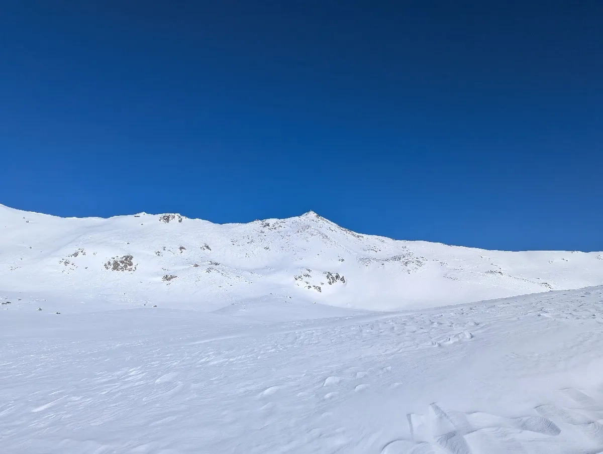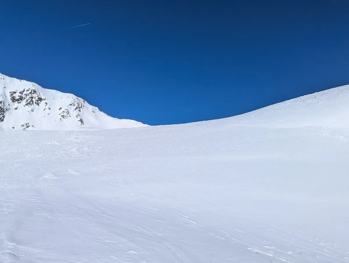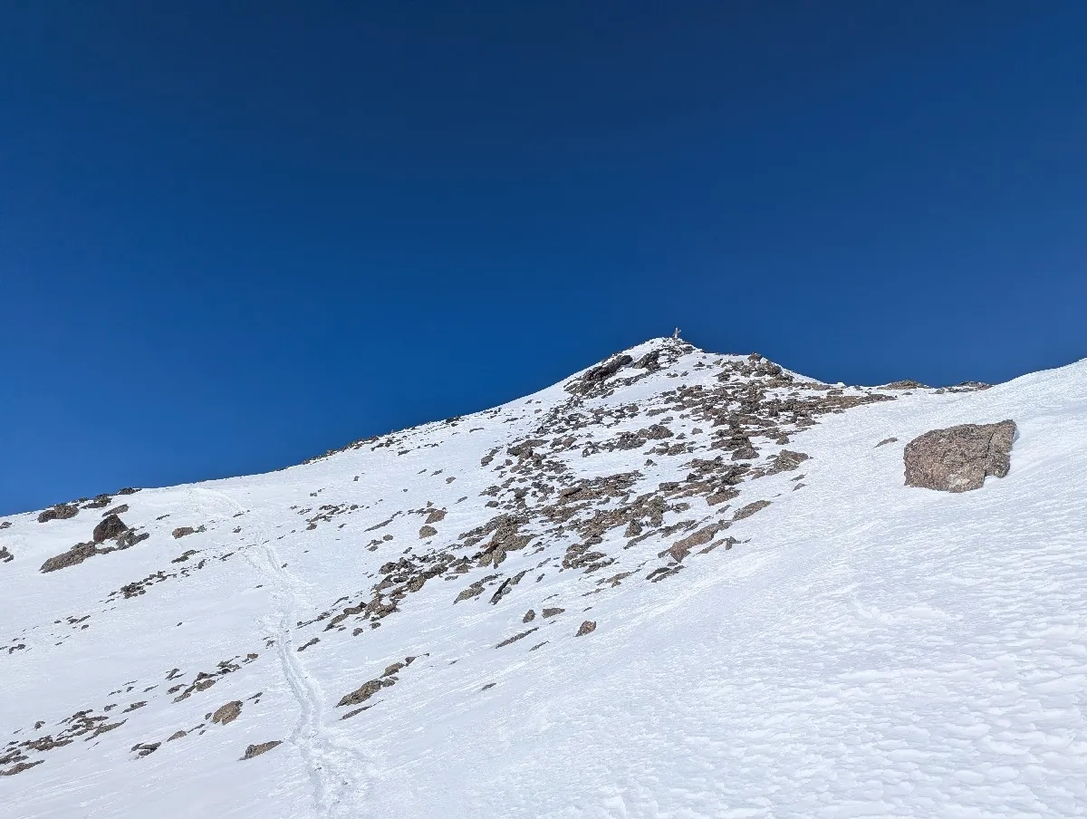 - Nach einem letzten flachen Plateau eröffnet sich erstmals der Blick auf den Gipfel. Je nach Schneelage gibt es mehrere Möglichkeiten für den finalen Aufstieg. In der Regel aber mit einem eleganten Rechtsbogen sanft aufsteigen und kurz unterhalb des Gipfels nach links queren (bei guter Schneelage ist auch ein direkter Aufstieg möglich). Das Skidepot befindet sich meist einige Meter unterhalb des Gipfels – die letzten Meter werden ohne Ski über einen gut gangbaren Grat bewältigt.