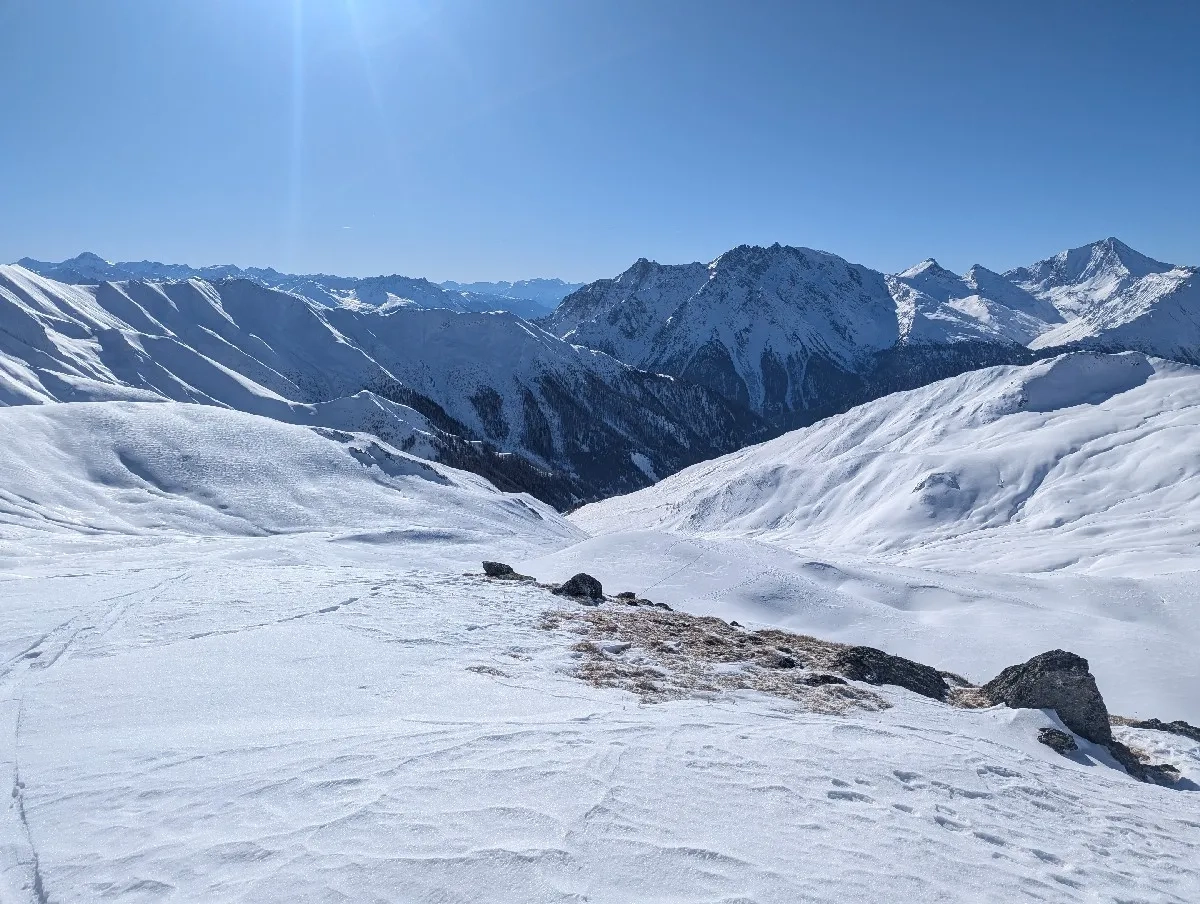 Ein echter Geheimtipp ist das Hintere Kreuzjoch. Mit seinen 2.853 Metern bietet dieser Gipfel nicht nur eine atemberaubende Aussicht, sondern auch eine spannende, aber machbare Herausforderung. Während der benachbarte Matthäuskopf oder der Untere Malfragkopf häufiger bestiegen werden, bleibt das Hintere Kreuzjoch oft ein ruhiges Ziel für Genuss-Skitourengeher. Die 1.350 Höhenmeter sind gut zu bewältigen, sofern eine solide Grundkondition vorhanden ist.